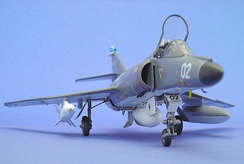 Nun kam der Part, warum ich unbedingt Klear benutzen wollte. Die Abziehbilder dieses Airfix-Bausatzes sind nämlich eher mittelmäßig, matt und neigen extrem zum silbern. Also habe ich die Nassschiebebilder in Klear eingebettet. Jede folgende Schicht löst die vorhergehende wieder etwas an und verbindet sich mit ihr. Das Prozedere habe ich ja bereits öfter beschrieben, so dass ich hier darauf verzichte. Leider sind die Decals auch verdruckt, so dass ich die roten Abziehbilder sämtlich nachmalen musste. Nach einer weiteren Schicht Klear habe ich mit einem leichten Washing die Gravuren hervorgehoben. Da mir mein Gunze Mattlack ausgegangen war, habe ich mit Xtracrylix gearbeitet. Mit dem Ergebnis bin ich eigentlich nicht ganz zufrieden, das „glanz-matte“ Finish passt jedoch ganz gut zu moderneren Jets. Die Rakete müsste übrigens eine beige-farbene Spitze mit anschließendem schwarzen Band haben, das wurde mir jedoch zu spät bekannt. Ich werde dies noch ändern, für den Moment ist es eben ein Transportdummy.
