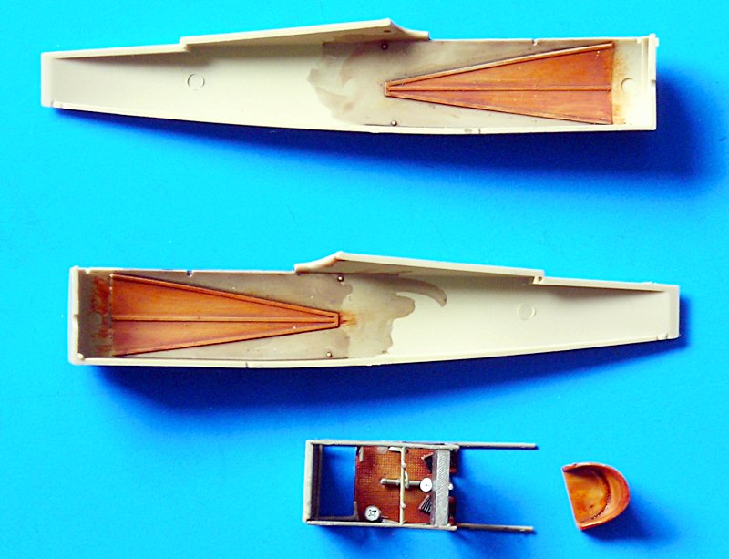 Zunächst habe ich die Rumpfinnenseiten und alle Stoff- oder Holzteile mit einem hellen beige gespritzt. Dann habe ich die Holzflächen abgeklebt und diese mit Ölfarbe behandelt (Sienna gebrannt), so dass eine Hozmaserung angedeutet wird. Nach eingehender Trocknungszeit wurden dann noch diverse Washes von Citadel (Flesh Wash (alte Serie), Ogryn Flesh, Devlan Mud und Badab Black (neue Washes)) verwandt. Eigentlich wären die stoffbespannten Teile mit einem Rautenstoff-Muster zu versehen, aber ich hatte nichts dergleichen vorrätig und der Bausatz enthält hier ebenfalls nichts. Daher sollten diese Bereiche leinenfarben dargestellt werden, was ich durch ein wash (Devlan Mud) etwas uneinheitlicher und gebraucht erscheinen lassen wollte.
