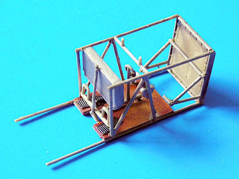Nun ging erst mal die große Suchaktion los, eine der Streben war nämlich unauffindbar ... und blieb es auch. Ich habe dann Ersatz aus Rundmaterial zurechtgeschliffen, was aber kein vollwertiger Ersatz ist, da die Spritzgussteile deutlich stabiler als die Evergreen Profile sind. Zum Glück biegt sich das Teil noch(?) nicht durch.