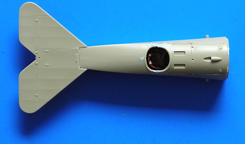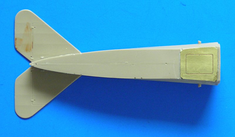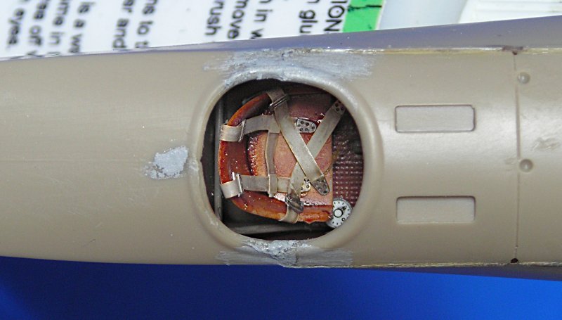 Ansonsten habe ich mich so ziemlich an die Bauanleitung gehalten, was für den Sitz schlecht war, da dieser offensichtlich nicht aus Holz, sondern aus Metall gefertigt war. Ich habe dann noch die Gurte aus dem Flashbackbausatz ergänzt und dann konnte der Rumpf geschlossen werden. Die Teilung der Cockpiteinfassung gefällt mir nicht besonders, da an dieser Stelle dadurch unnötige Spachtelarbeiten anfallen. Für den vorderen Rumpfbereich verwandte ich das Ätzteil von Flashback, da ich keine Lust verspürte, diese Platte zu spachteln und evtl. nachzugravieren. Die Anpassungsarbeiten waren zum Glück minimal. Dann habe ich auch gleich noch das Fahrwerk und das Höhenruder angeklebt und das Ganze erst mal zum Durchtrocknen zur Seite gelegt.