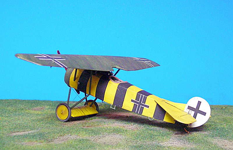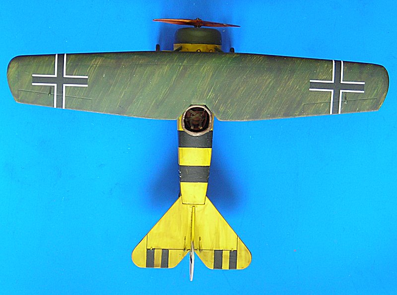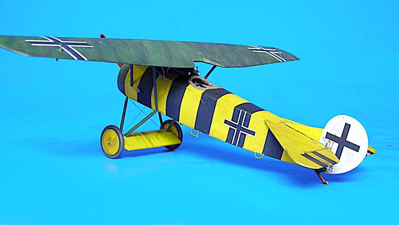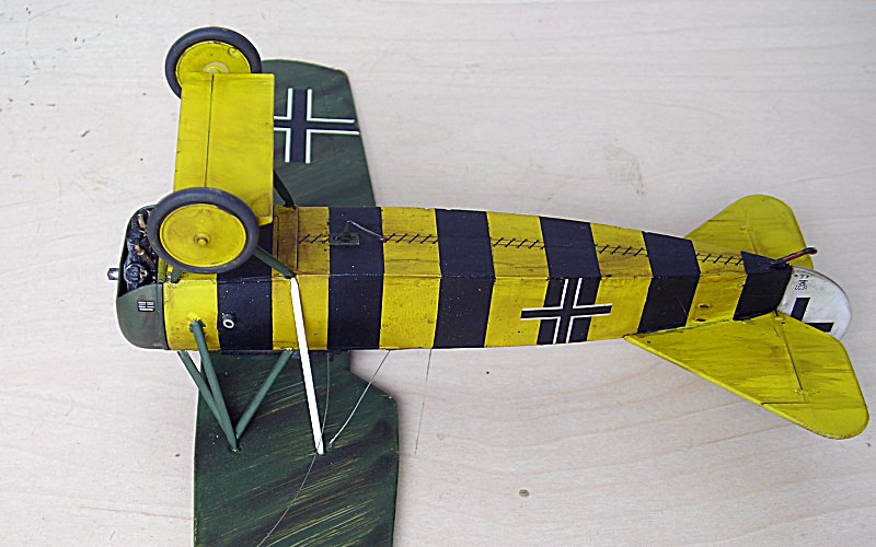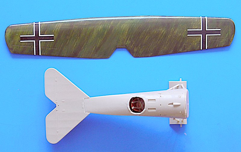 Die Wartezeit habe ich mit der gestromten Bemalung der Flügel verbracht. Diese hatten ja schon die Grundierung in "Sail color" von Gunze erhalten. Die Grundlage bildete ein Anstrich mit "Olive Drab" von Tamiya, den ich solange mit einem breiten Flachpinsel bearbeitet habe, bis die Farbe leicht antrocknete und der streifige Eindruck entstand. Darauf habe ich dann mit "Devlan Mud" und "Thraka Green" unregelmäßige Filter aufgetragen, bis mir das Ergebnis gefiel. Das Ganze habe ich dann mit Klear (Future) versiegelt. Für den Anbau an das Modell habe ich einfach den besser gelungenen Flügel gewählt, da auch die Bauanleitung auf keine Unterschiede der beiden Flächen eingeht. Zunächst habe ich die Balkenkreuze aus dem Eduardbausatz aufgebracht und wiederum versiegelt. Dann wurden noch kleine Löcher für die Steuerseile gebohrt und unsichtbares Nähgarn ("smoke") eingeklebt. Abschließend sorgte Gunze Mattlack für ein mir angenehmeres Finish.