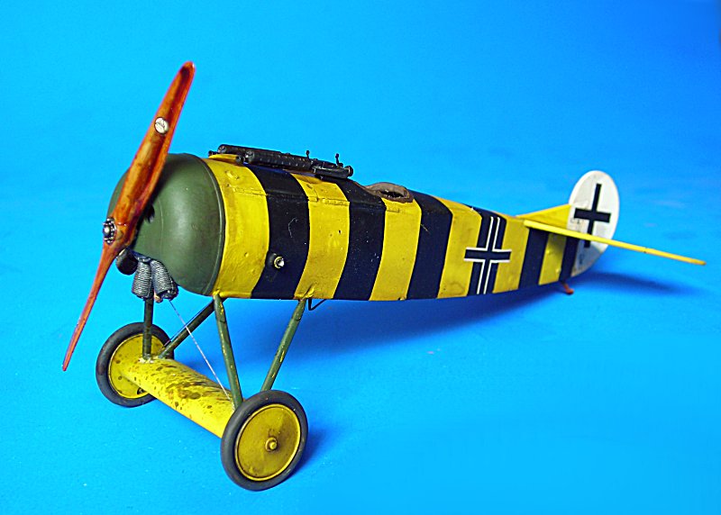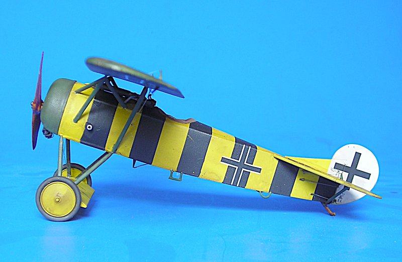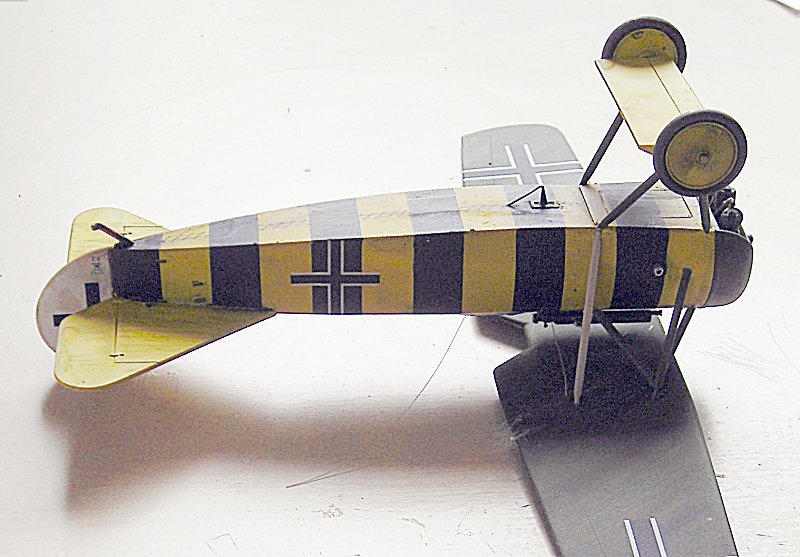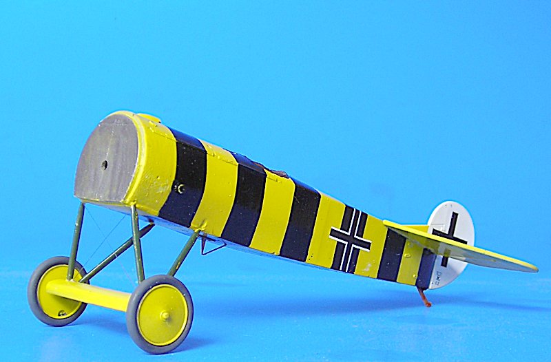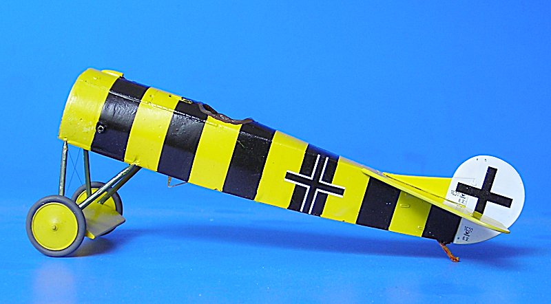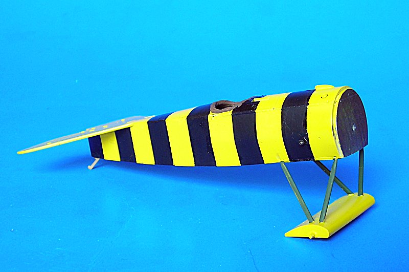 Nun ging es zurück zum Rumpf. Das Cockpit habe ich abgeklebt und die gesamte Baugruppe mit Weiß grundiert (Gunze H11). Nach kurzem Antrocknen folgte gleich Gelb (Gunze H4) und dann hieß es wieder warten. Da ich ja die Abziehbilder für die Streifen verwenden wollte, erhielt der Rumpf noch eine Schicht Klear. Nach wiederum aureichender Zeit zum Durchtrocknen, brachte ich die Streifendecals auf. Diese passten natürlich nicht ganz, darüber hinaus waren sie auch sehr spröde und brachen schnell. Mir war aber die Nacharbeit bzw. Korrektur lieber, als das Ausmessen und Abkleben des Rumpfes .. suum cuique, wie man so schön sagt. Bevor ich die fertigen Räder anklebte, habe ich noch die Verspannung des Fahrwerks erledigt. Dazu habe ich wieder Polyamidgarn in "smoke" verwandt.