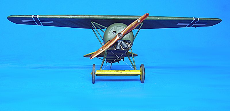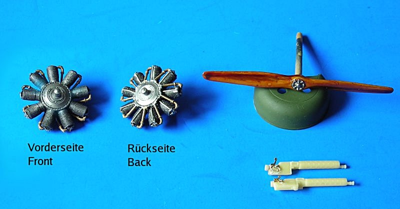 Nebenbei habe ich noch einige Kleinteile zusammengebaut und bemalt. Der Motor erhielt ein Ätzteil aus dem Flashback-Bausatz und wurde Schwarz grundiert und Alu trockengemalt sowie die Details laut Bauanleitung ergänzt und bemalt. Der Propeller ist beige grundiert und mit Lederbraun wurde die mittlere Holzschicht angedeutet. Flesh Wash gab dem ganzen Glanz und eine rotbräunliche Färbung. Die Haube wurde olivgrün gespritzt, wie auch alle Streben und Metallanbauteile, hier jedoch meist mittels Pinsel aufgetragen.