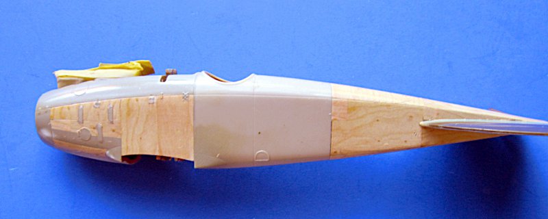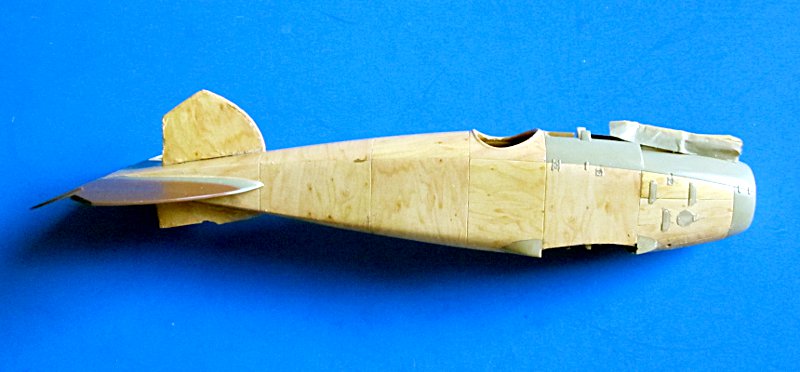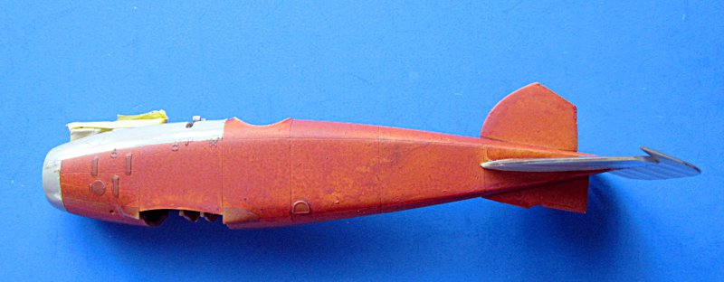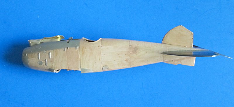 Nun konnte der Rumpf zusammengeklebt und nach der Trocknung verschliffen werden. An ein zwei Punkten habe ich etwas mit Mr. Surfacer 500 nachgeholfen. Das Höhenleitwerk habe ich auch um die Steuerfläche erleichtert und gleich angeklebt (bereits bemalt). Das Resinteil von Black Dog passt leider nicht sehr doll. Den Bug habe ich dann RLM 02 von Gunze gespritzt, welches vielleicht etwas zu warm für den Farbton aus dem Ersten Weltkrieg ist, diesem aber für meinen Geschmack nahe genug kommt.