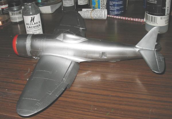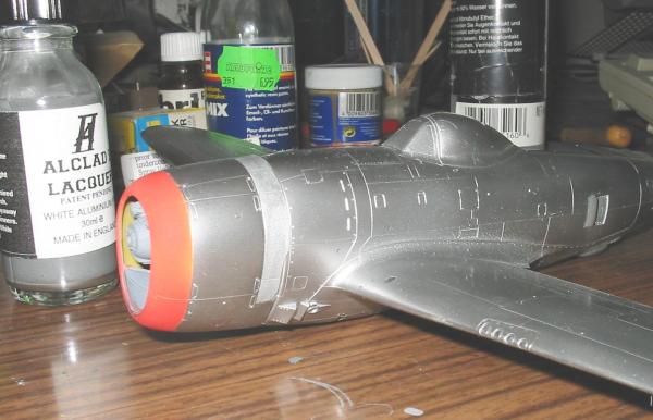 Ich habe bei diesem Projekt erstmals das Alclad II System benutzt, weil man davon sehr ansprechende Ergebnisse zu sehen bekommt. Also erst mal die graue Grundierung drauf, trocknen lassen, dann kleine Unebenheiten usw. ausmerzen. Soweit alles i.O. Dann das Schwarz glänzend (bildet an den Gravuren Hügel, also extrem dünn spritzen!). 24 h trocknen lassen. Nun erstmals Aluminium. Sieht toll aus und fühlt sich schnell trocken an. Aber Vorsicht!!!! Am besten erst mal ein paar Wochen oder Monate oder was weis ich trocknen lassen!!! Ich hab's nämlich geschafft mehrmals -jeweils nach etwa 1 Tag Trockenzeit- Fingerabdrücke reinzudrücken und dass obwohl ich einen Griff zur Handhabung dran hatte. Ich vermute es lag am nicht ganz durchgetrockneten Schwarz, oder das Alu hat diesen Vorlack wieder durchweicht. Ich hatte jetzt jedenfalls von "All crapp" schon ziemlich die Nase voll. Endlich hatte ich die Farbe halbwegs gleichmäßig ohne Fingerabdrücke drauf und auch "ziemlich durchgetrocknet"(??) und dachte, dass jetzt wohl die Nassschiebebilder drauf könnten.