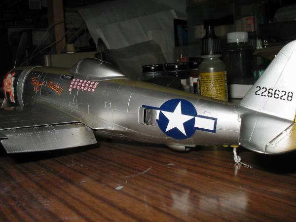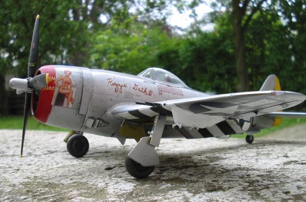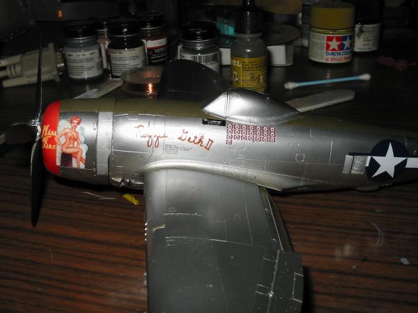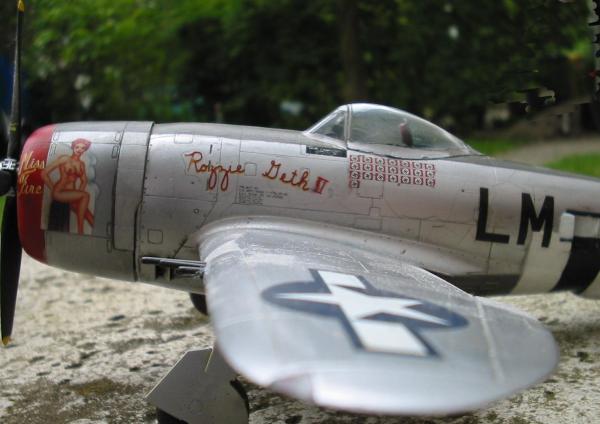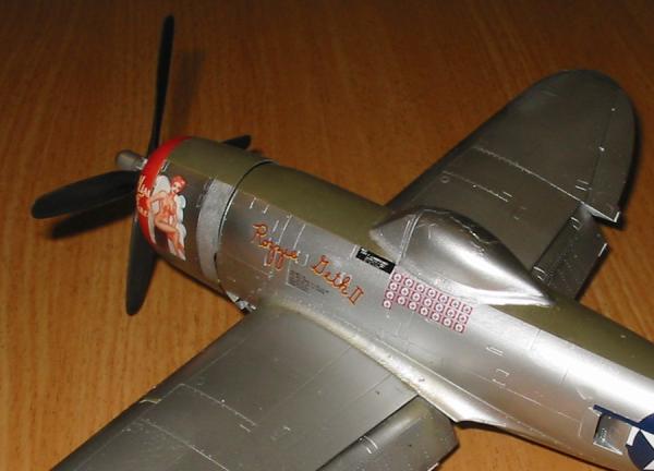 Zur Bemalung:Ich habe mir irgendwann mal den Decal Satz von Skydecals zugelegt. Besonders gefallen mir die Maschinen in Naturmetall mit den mehr oder weniger bekleideten Damen. Da ich hauptsächlich Asse baue, habe ich mich für die Variante von Fred Christensen "Rozzie Geth"/ "Miss Fire" entschieden. Eine kleine Internetrecherche (u.a. auch mit Hyperscales Hilfe) brachte zu Tage, dass der Font bei Sky Decals falsch ist, also musste auch der Cutting Edge Satz beschafft werden. Weiterhin fehlen allen bisher erhältlichen Decalsätzen die Abschussmarkierungen für die rechte Seite, wo der extrem stolze Crewchief neben einem schwarzen Feld mit Pilotennamen auch für jeden Abschuss ein schwarzes Balkenkreuz angebracht hat. (Ein besonderer Dank gebührt Stephen Mudgett für diese Informationen). Bei mir werden diese Balkenkreuze bis zum erscheinen von brauchbaren Abzeibildern erst mal fehlen. (Inzwischen erhältlich bei Lifelike Decals)