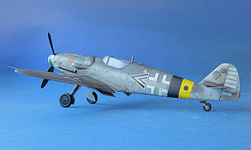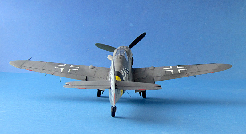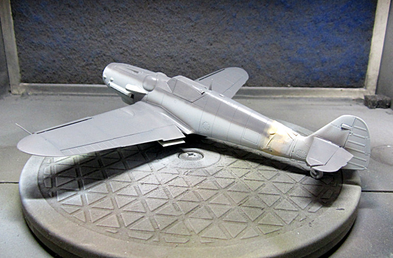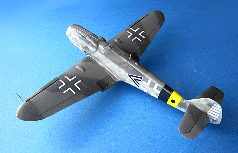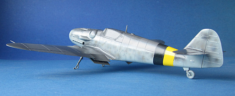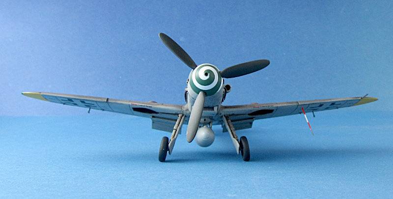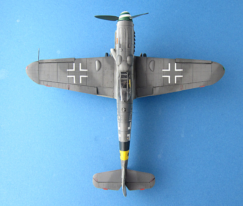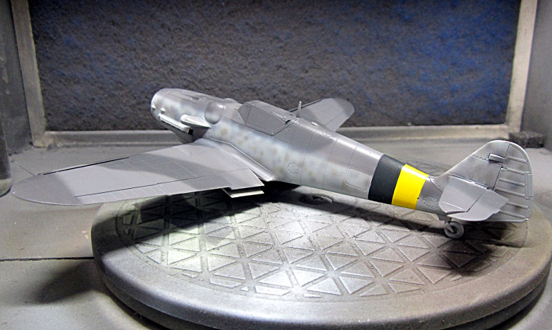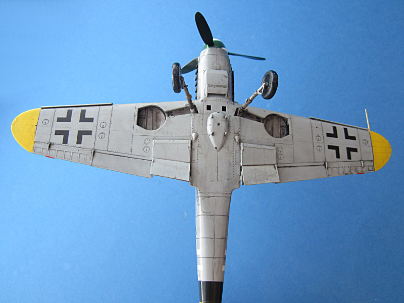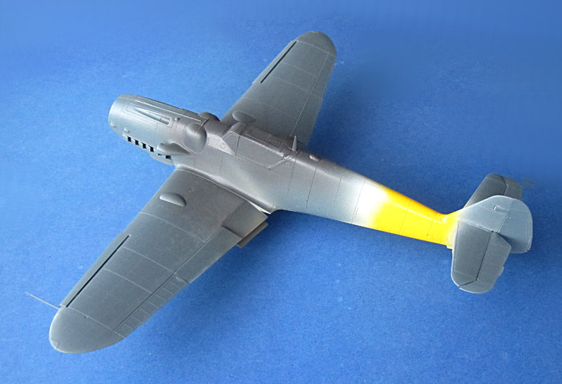 Zunächst wurde der Cockpitbereich RLM 66 gesprüht. Dann habe ich das Rumpfband weiß grundiert und anschließend die Kühlerschächte mit RLM 02 geairbrushed. Schließlich kam das Gelb für die eine Hälfte des Reichsverteidigungsrumpfbandes des JG5.