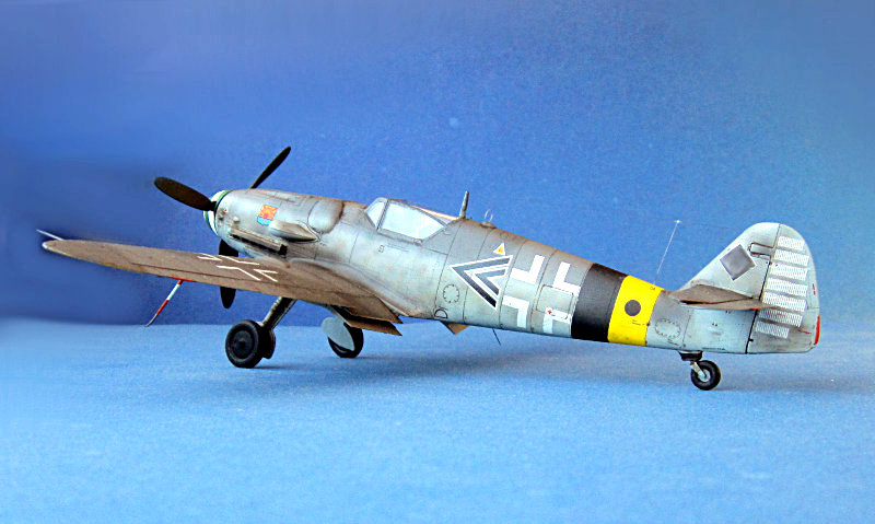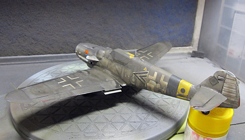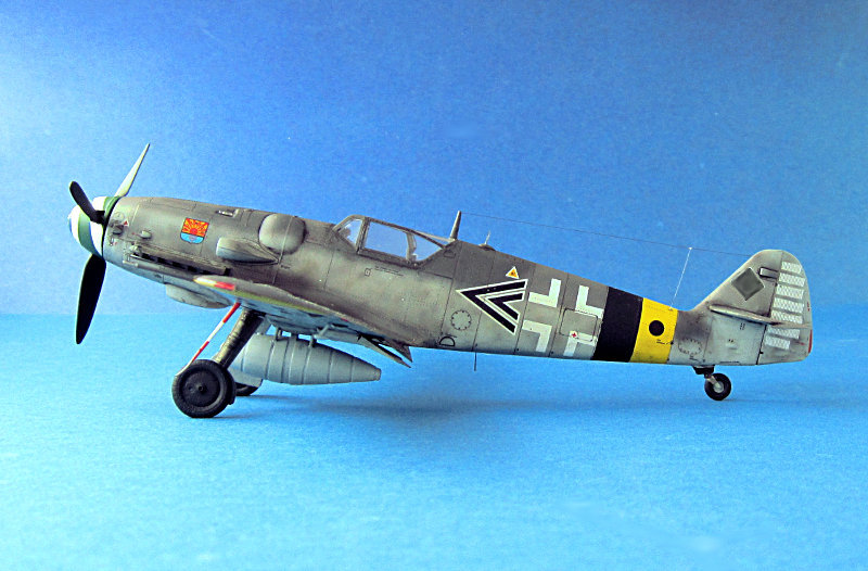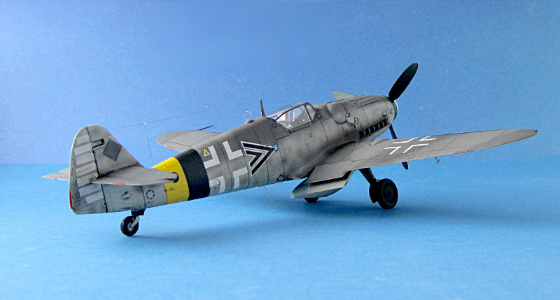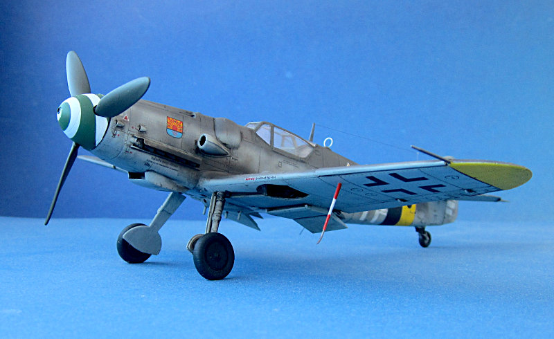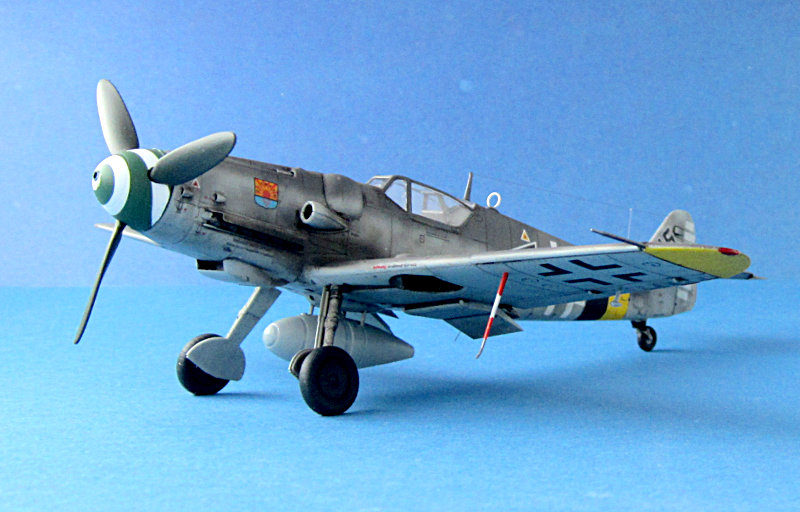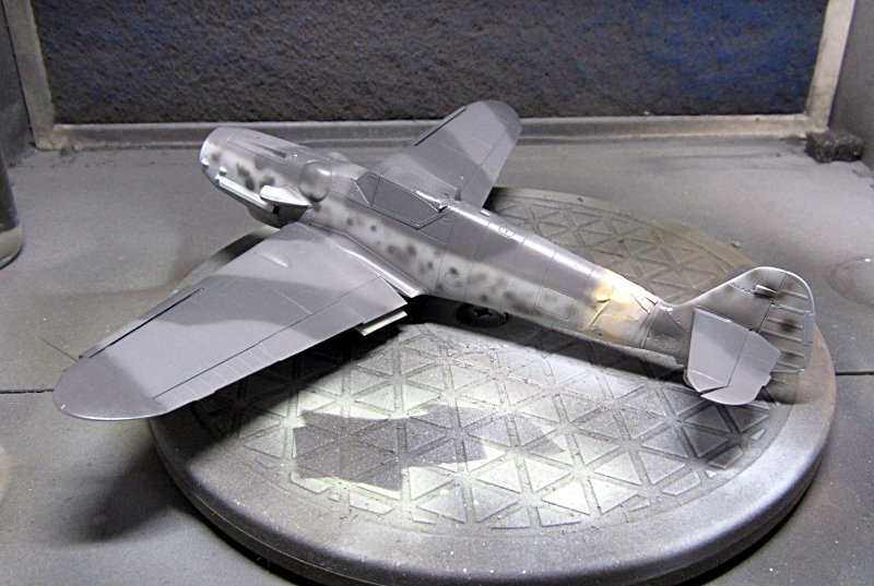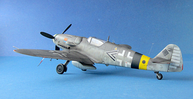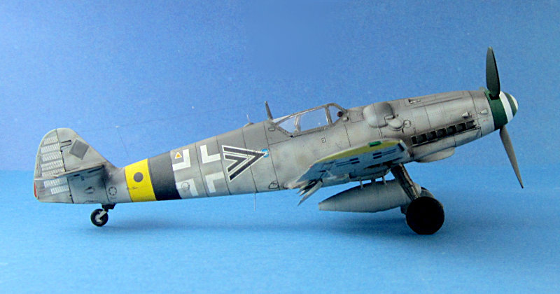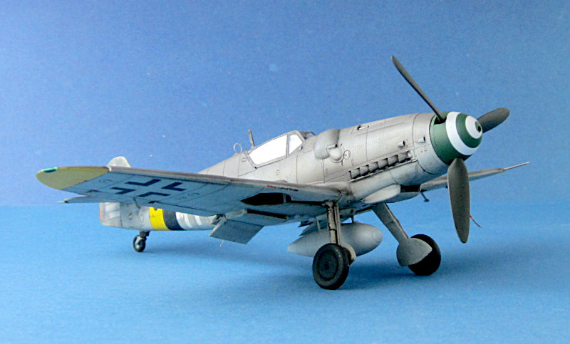 Zunächst wurde der Cockpitbereich RLM 66 gesprüht. Dann habe ich das Rumpfband weiß grundiert und anschließend die Kühlerschächte mit RLM 02 geairbrushed. Schließlich kam das Gelb für die eine Hälfte des Reichsverteidigungsrumpfbandes des JG5.