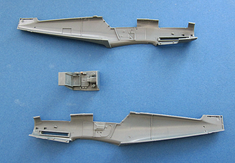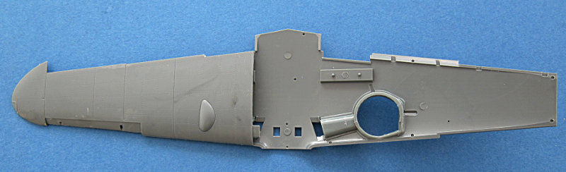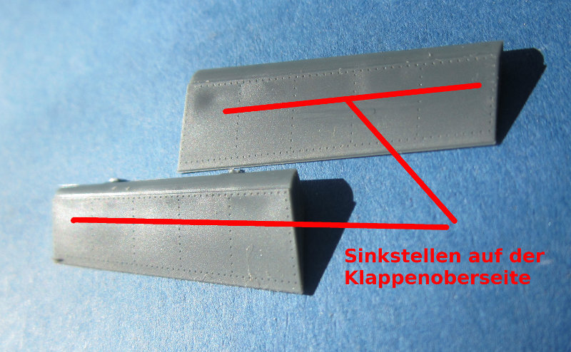 Los gehts also mit dem Bau. Damit ich erst mal den Bausat zkennenlerne begann ich mit dem Flügel. Für jeden Fahrwerkschacht gibt es 4 Teile, auf dem Gießrahmen sind aber diese Teile in verschiedenen Varianten enthalten, da dieser ein Standardrahmen für die Varianten F-K ist. Es gilt also der Bauanleitung pärziese zu folgen. Bevor ich den Flügel zusammenklebte, habe ich den feinen Grat auf der Klebefläche (Richtung Flügelspitze) entfernt, damit die Passung wirklich schraubendsaugend ist. die Querruder passen gut uns sind Problemlos zu verwenden. Die mittleren Landeklappen haben leider Senkstellen. WIe gesagt, ich hab den Eindruck, dass dieses Produktionslos recht zuügig durch die Maschinen gejagd wurde und daher der feine Grat und die Senkstellen zu beobachten sind. Ich habe mich damit beholfen, dass ich die Eninsinkunegn verschliffen habe, die Passnasen entfernt habe und die Bauteile seitenverkehrt am jeweils anderen Flügel angebaut habe. So hat man zumindes auf der Oberseite die feinen Nietenreihen. Man kann sie jedoch auch mit entsprechendem Werkzeug restaurieren.