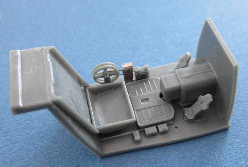 Nun ging es weiter mit dem Cockpit. Die Änderungen hier sind marginal und der grundsätzliche Aufbau der 109er Cockpits unterscheidet sich ohnehin nur wenig bei den verschiednen Herstellern - ist eben dasselbe Vorbild. Eduard hat sich bemüht Fotoätzteile nur an sinnvollen stellen einzusetzen und natürlich sieht man auch hier schon, dass Weekend Editionen geplant sind, denn man kann das Modell auch ohen Ätzteile bauen. Ich habe zunächst mal die verschiedenen Teile zuzammen bzw. angebaut, die RLM66 bemalt werden sollen. Dazu gehört auch die Trimmung links vom Pilotensitz.
