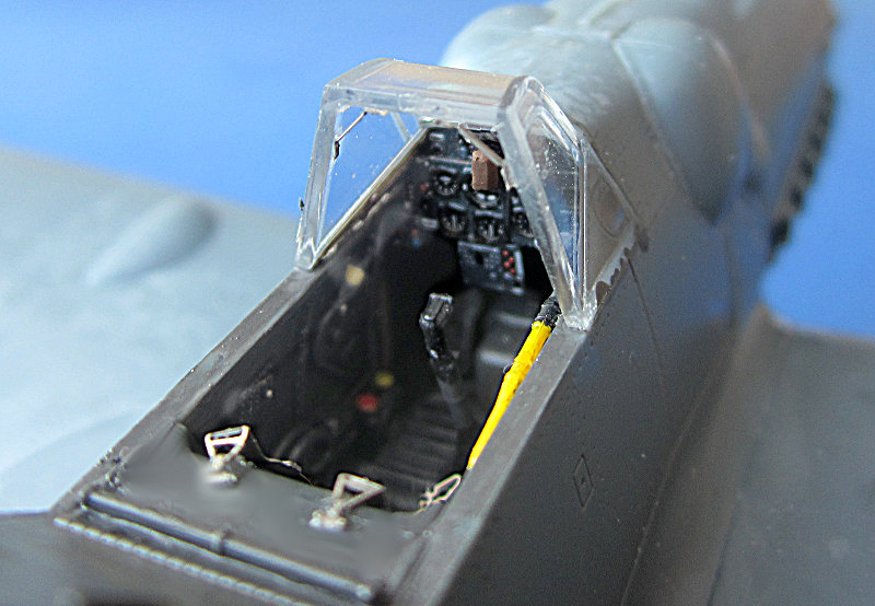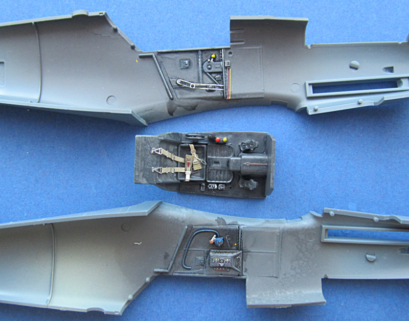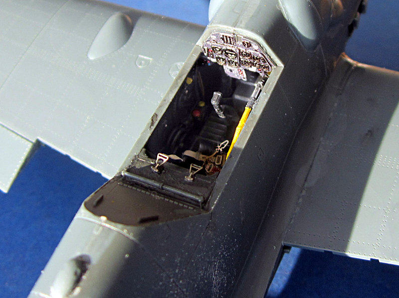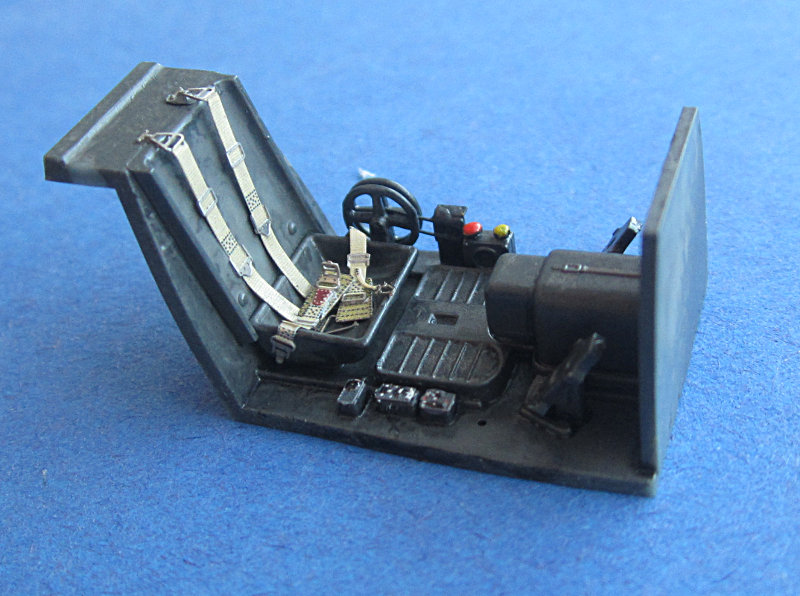 MIt etwas Farbe und weiteren Fotoätzteilen sieht das auch schnell recht ordentlich aus. Wer will kann hier natürlich mehr Zeit und Arbeit investieren, da dieses Modell jedoch geschlossen dargestellt werden soll, ist dies mehr als ausreichend. Das Instrumentenbrett ist wieder als mehrteiliges PE-Sandwich ausgeführt und sieht fertig gewohnt gut aus. Ich hab danach gleich weiter gemacht und die Teile verklebt. Vorher hatte ich - entgegen der Bauanleitung - die Rumpfhälften mit den Leitwerkshälften verbunden. Daher auch die Klammern am Leitwerk... beim nächsten Modell probiere ich es mal nach Anleitung.