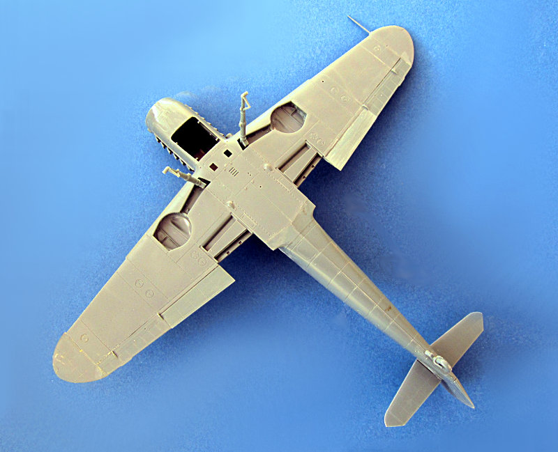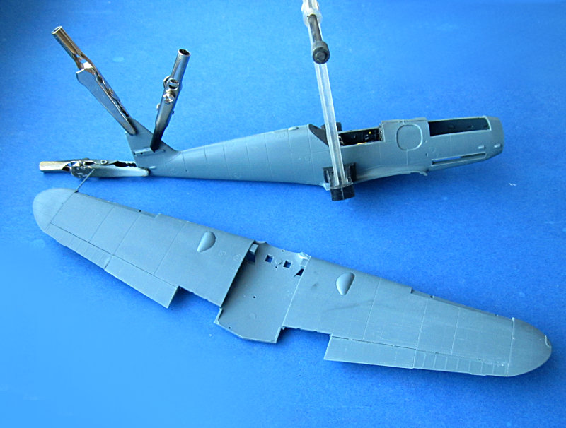 Nach dem Trocknen habe ich die überschüssige Farbe abgewischt und somit bleiben nur die versenkten Details dunkel. Auf dem RLM 76 wirkt dies etwas stark, aber dies ist diesmal (wieder) Absicht um die Struktur hervorzuheben. Es grenzt übrigens an ein Wunder, dass das Pitot bisher noch nicht abgebrochen ist. Vorsorglich sollte man hier Ersatz von Master (oder Ähnliches) in Erwägung ziehen. Ebenfalls negativ fallen die nicht separaten Positionslichter auf. Am Klarteilegießast wäre sicher noch etwas Platz dafür gewesen. Bei diesem Modell aus dem Kasten werde ich dies wie in der Bauanleitung angegeben mit Farbe darstellen.