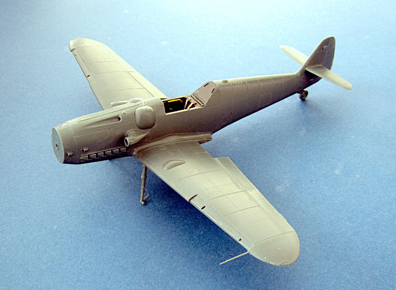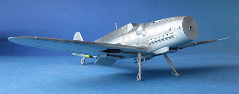 Im Bug habe ich nun die Auspuffstutzen eingeklebt, das Leitblech-Ätzteil aber noch weggelassen. Dass die MG-Kanäle hinten verschlossen werden, gefällt mir gut. Somit können die kleinen Läufe wenigstens nicht im inneren des Modells verschwinden. Ich werde diese erst nach der Lackierung einsetzen. Das Scharnier passte nicht ganz so toll, aber hier gibt es auch ein wenig Grat, den ich vielleicht nicht gründlich genug entfernt habe. Die Motorhaubenversiegelung zwischen den Beulen (beim Original eine Gummilippe) geht beim verschleifen der Rumpfhälften verloren. Vielleicht kann man dies durch bessere Vorbereitung vermeiden, ich habe diese einfach durch einen gezogenen Gussast, der mit Kleber eingeschmolzen wurde, ersetzt. Nun kamen noch die Beulen und der Laderlufteinlauf dran und das Modell sieht schon nach Bf 109G-6 aus. Heute morgen kam dann noch das Farwerk dran. die neuen quadratischen Aufnahmelöcher sind größer und das Modell steht jetzt etwas breitbeinig da, insgesamt ist der Stand aber deutlich schöner als beim 2014er Modell und wird dem Original besser gerecht. Die Passung ist hier gut, aber wenn der Klebstoff die Teiel anlöst, gibt es ein wenig Spiel, so dass man trotzdem auf eine korrekte Ausrichtung achten sollte.