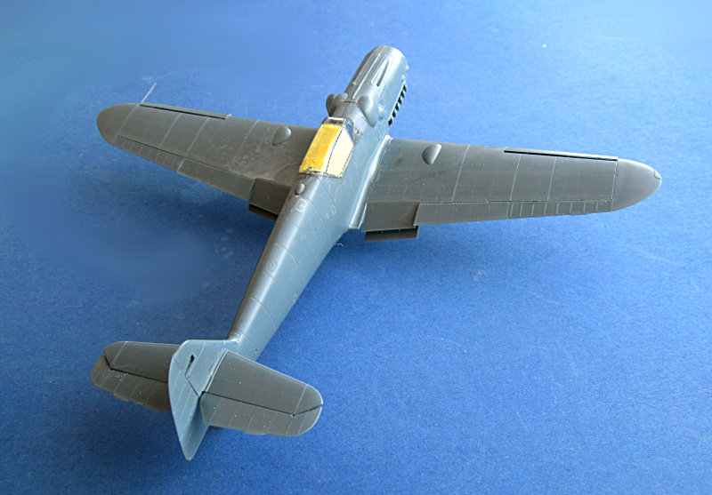 Bevor es mit Farbe weiter gehen kann ist noch etwas Kleinkram zu bewältigen. Die drei Kühler müssen mit Fotätzteilen versehen und angebaut werden. Die Passgenauigkeit ist gut. Beim Kinnkühler hätte ich mir gewünscht die abschlussplatte vorn noch nicht montiert zu haben, dann wäre ein Gegenhalten von innen möglich gewesen. Es ging aber auch so. Hier machte sich auch wieder der etwas zu sehr zusammengepresste Rumpf bemerkbar - enge Passung der Baugruppe. Die Flächenkühler müssen wieder von etwas Grat befreit werden, damit sie perfekt passen. Ich habe mit Klemmen etwas nachgeholfen. Die Kühlerklappen wurden deshalb etwas später montiert. Im Cockpit muss noch das Revi ergänzt werden. Auch der Windschutz bekommt noch 3 Fotoätzteile und der Kopfpanzer muss maskiert und bemalt werden. Die für meine Version zu verwendende Erlahaube hat eine Aussparung, die eigentlich nur bei geöffneter Haube benutzt wird. Evtl. muss ich diese noch verschließen. Die Haube habe ich nach einbau des Kopfpanzers jedenfalls schon mal angeklebt. Für die Antenne (die bei Dörrs Maschine an der Haube befestigt is, habe ich noch ein kleines Loch gebohrt. Nun müssen noch die Masken drauf und dann kommt Farbe ins Spiel.