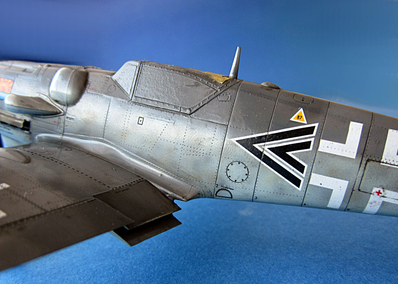 Nun also die Abziehbilder. Wie schon erwähnt sind diese von Eduard produziert und sehen auf dem Papier recht gut aus. Es gibt einen minimalen Versatz, den man z.B. beim sehr schmalen Rand der Hoheitszeichen ausmachen kann. Leider habe ich die Nassschiebebilder wie die Cartograf-Decals verarbeitet. Man sollte hier aber sehr vorsichtig sein, denn das Verhalten ist eher wie bei den Propagteam-Decals, die früher einmal den Eduardbausätzen beilagen. Bei mir hat es zwei Balkenkreuze erwischt. Diese haben sich im ca. 60° heißen Wasser umgefaltet und waren nicht mehr dazu zu bewegen, sich zurückfalten zu lassen. Für die Unterseite habe ich gleichartigen Ersatz in der Restebox gefunden, so dass ich es direkt verwenden konnte. Oben musste das bereits feste Decal der rechten Seite überklebt werden, da ich kein Abziehbild mit gleicher Balkenstärke und -länge gefunden habe. Die Dünne der Abziehbilder macht sich bei der Anpassung dieser an die Modelloberfläche aber sehr positiv bemerkbar. Selbst die feinen Nietenreihen sind weiterhin auszumachen. Im Bild fehlen noch einige Wartungshinweise, die Hoheitszeichen und das Geschwaderemblem.