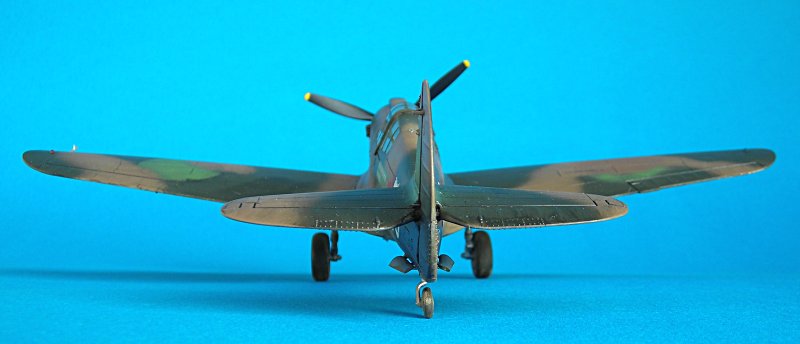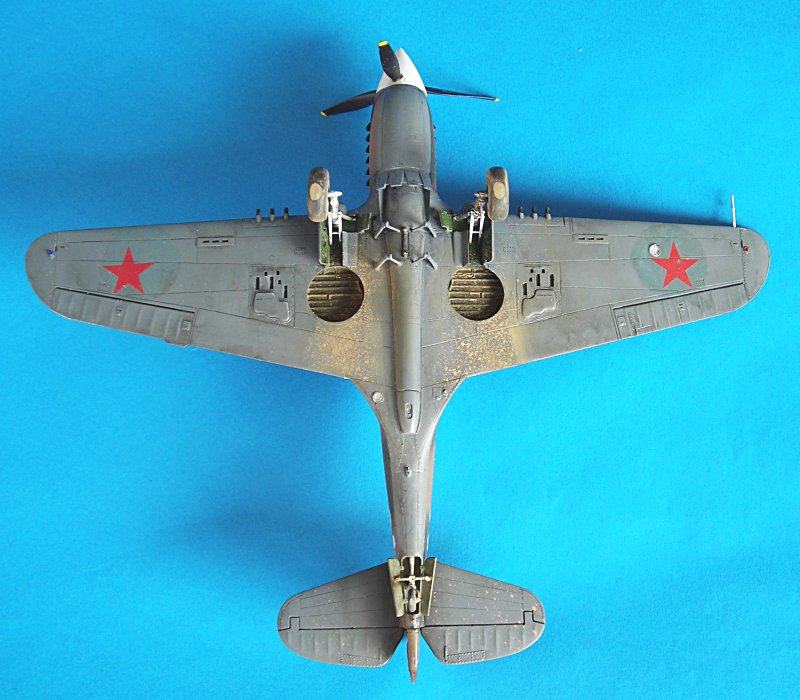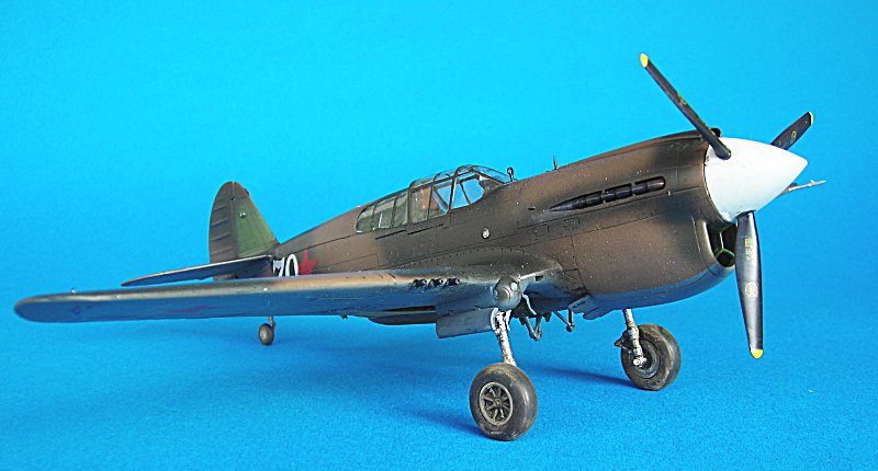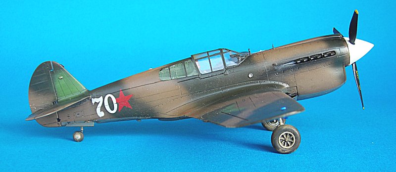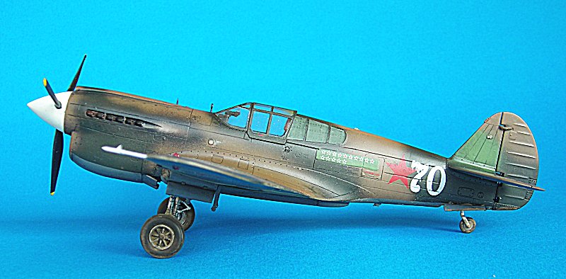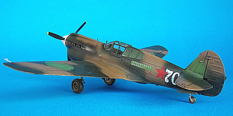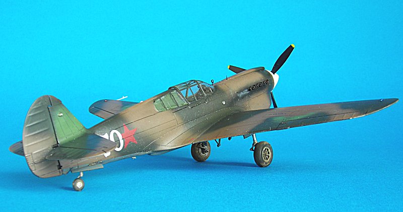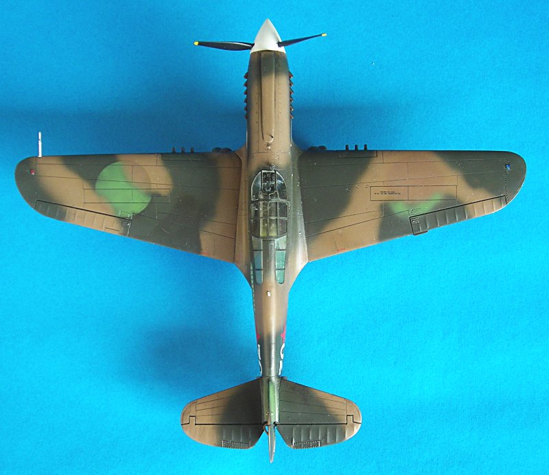 Die Farben wurden anhand der Bauanleitung von "Tally Ho!" gewählt und mit der Spritzpistole aufgetragen. Anschließend einige dünne Schichten Klear und dann kommen die Abziehbilder, die sich mit etwas Daco Orange sehr schön in die Gravuren legten. Danach wieder wenige dünne Schichten Klear. Nach dem Durchtrocknen habe ich die Gravuren mit Wasserfarbe hervorgehoben. Anschließend wurden die fehlenden Kleinteile (bis auf die Warn- und Positionslichter) angebracht und das Modell mit Mattlack versiegelt. Nun noch die letzten Klarteile und die P-40E in sowjetischen Diensten ist fertig.