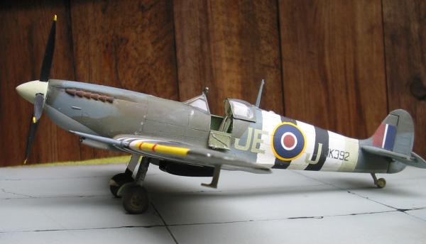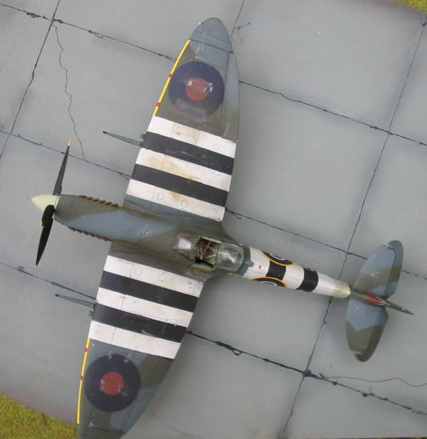 Die Farbgebung erfolgte gemäß Bauanleitung mit Extracolor Farben (die waren gerade verfügbar, ansonsten bevorzuge ich Acrylfarben). Ich habe zuerst die Invasionsstreifen und das Rumpfband auflackiert, dann abgeklebt und anschließend den Tarnverlauf gespritzt. Ich habe auch schon begonnen die Decals aufzubringen (die Buchstaben decken schlecht). Jetzt fiel mir der Decalsatz von Victoryproductions in die Hände (naja, eigentlich war der teuer bezahlt...). Dieser enthält einige von Johnnie Johnsons Maschinen aber leider keine mit vollständigen Invasionsstreifen. Grund dafür ist, dass für die Zeit von Mai bis etwa August keine Fotos bekannt sind. Ich hatte aber keine Lust nochmal alles neu zu machen und so stellt diese Bemalung einen wahrscheinlichen Anstrich und die wahrscheinliche Konfiguration für den Invasionszeitraum dar. Während des Sommer 1944 wurde das Flugzeug nämich auch auf den e-Flügel umgebaut. übrigens gehört das Ahornblatt nicht auf diese Maschine.