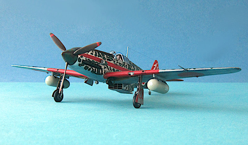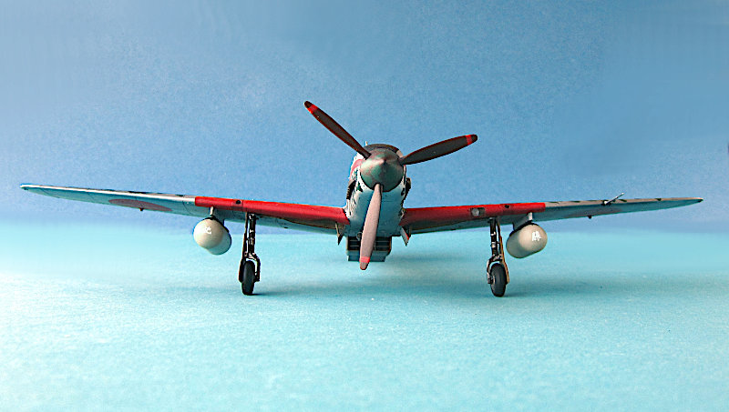 Die Farbgebung dieses Flugzeugs für den Begleiteinsatz zum Schutz der 18. und 19. Spezialangriffsstaffel am 19.März 1945 bietet breiten Raum für Spekulationen und Diskussionen. Ich habe mich bei den Freund-Feind-Kennungen (Flügelvorderkante) an Lifelike und meinen eigenen Eindruck des Bildes gehalten und diese wie die Einheitsmarkierungen am Heck rot lackiert. Nach dem Demaskieren des Modells lackierte ich zur Vorbereitung der Nassschiebebilder und der Wet Transfers eine Schicht X-22 Klar glänzend auf das Modell.