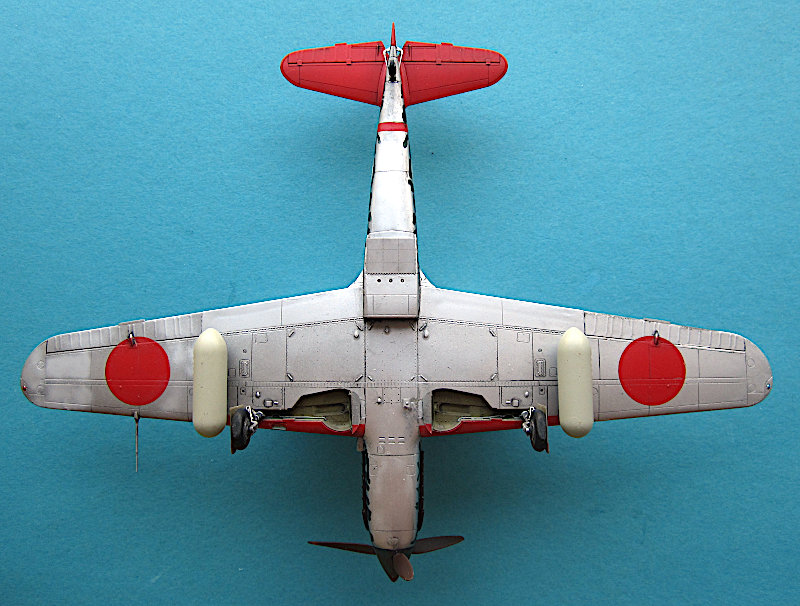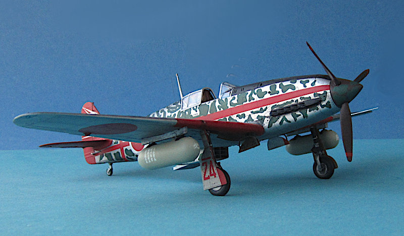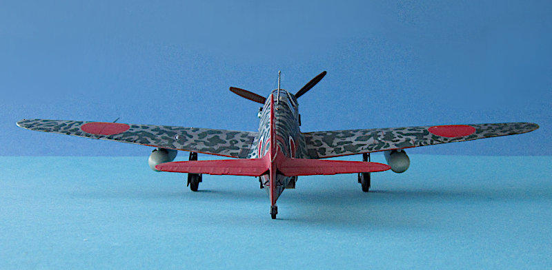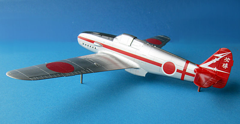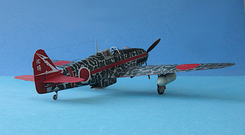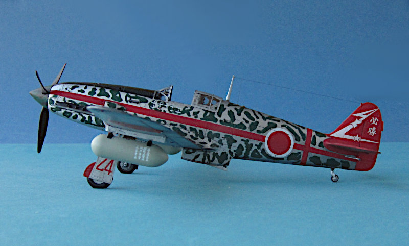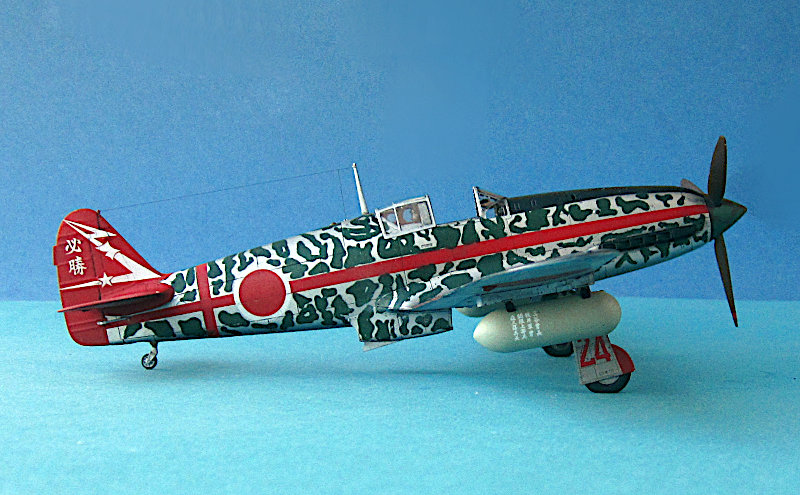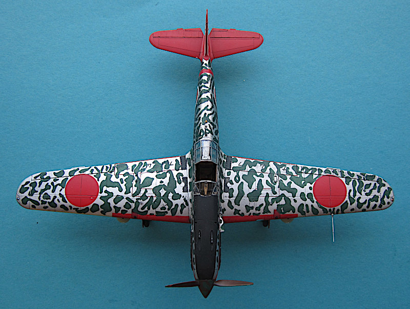 Ich wollte ein Flugzeug von Teruhiko Kobayashi darstellen und habe mich für die fotografisch dokumentierte Version mit rotem Längsstreifen und roten Freund-Feind-Kennungen, sowie beschrifteten Zusatztanks entschieden. Sehr hilfreich ist dafür der Satz von Lifelike gewesen, für den mir der Hersteller freundlicher Weise auch die aktuelle Bauanleitung der Wiederauflage zur Verfügung gestellt hat und ich somit den letzten Kenntnisstand zu den Bemalungen nutzen konnte. Von den Nassschiebebildern des Satzes habe ich wenige genutzt, da diese noch von Propagteam stammen und teilweise schwierig zu verarbeiten sind. Im Bausatz war auch fast alles enthalten, was ich brauchte. Insgesamt kann man Einiges an der Farbgebung kontrovers diskutieren, dies ist meine Interpretation des Bildes.