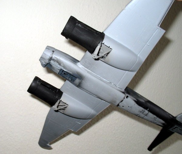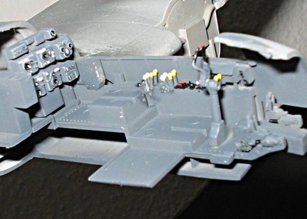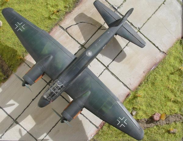 Der Bau erfolgte nach den Bauanleitungen von Revell und MDC. Revell hat den Bausatz noch um einige Passfedern und -stifte ergänzt, so dass das Basteln gegenüber dem Dragon Original etwas erleichtert ist. Unbedingt sollte man vor dem Kleben trocken anpassen und auch zwischendurch immer mal den Sitz der Teile überprüfen. Bei entsprechender Sorgfalt erwarten einen aber keine unlösbaren Probleme. Im Cockpit habe ich Gurte aus Eduards Bombergurte-Satz verwendet. Das geht schnell und sieht gut aus. Da ich meine erste Kanzel beim temporären Ankleben für das Airbrushen versaut habe, musste ich mir eine bei Revell nachbestellen (hat 5 Euro gekostet). Bei dieser habe ich dann vergessen die Vorhänge nachzurüsten, aber dies fällt nicht besonders auf (wenn man es nicht weis...). Bei den Motoren muss man etwas aufpassen, dass man später nicht den leeren Motorraum sehen kann. Auch kam hier etwas Spachtel zum Einsatz. (Zur Kontrolle habe ich die Gondeln schwarz gespritzt.)