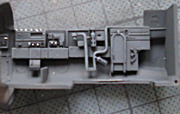 Nun kann man auch schon mit der Bemalung anfangen. Naja, "schwarz-über-alles" hört sich nicht besonders kompliziert an, ist aber im Maßstabsmodellbau recht schwierg zu bewerkstelligen. Wenn man ein Modell wirklich komplett "dunkelschwarz" spritzt, gehen jegliche Konturen flöten und es sieht irgendwie spielzeughaft (und irgendwie wie Kohle) aus. Ein Washing ist dann auch nicht mehr wirklich möglich. Zunächst habe ich mir also ein dunkles Grau gemischt (Tamiya Farben plus X20a Verdünner). Irgendwie fand ich dann ganz dunkelgrau doch etwas langweilig.