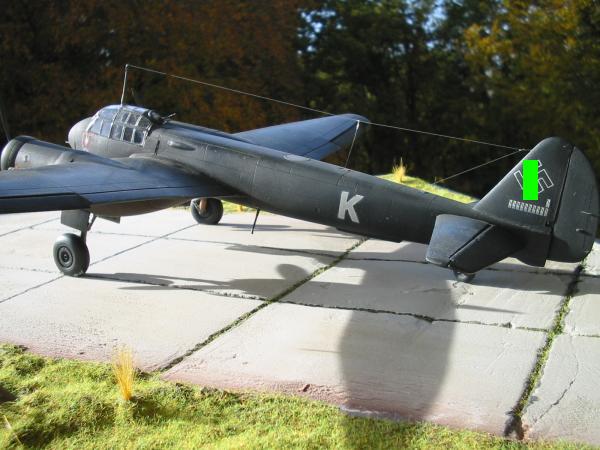 Die Hoheitszeichen sind gespritzt (Eduard Maskensatz), die Abschussmarkierungen sind aus dem Bausatz und nicht ganz richtig (sie müssten 3 schwarze Querbalken haben). Auch das Nachtjagdzeichen am Bug ist aus dem Bausatz und angepasst (roter Rand handgemalt). Die meisten Probleme bereitete der Kennbuchstabe. Erst der kürzlich erschienen Owl Decalsatz "Nachtbomber WNr.1" enthielt ein hellgraues K (RLM 77), dem dann noch ein weißer Rahmen verpasst wurde --- eigentlich habe ich den Decal Satz mit ca.10-15% Vergrößerung kopiert und dann ausgeschnitten und weiß gespritzt und dann das Abziehbild "draufgeklebt".