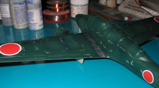 Anschließend habe ich eine Mischung aus X 19 Rauch, X 1 Klar, etwas schwarz (ganz wenig) und Tamiya Verdünner zusammengerührt. Damit wurden die Blechstöße auf Ober- und Unterseite betont. Nebenbei mussten natürlich auch die gelben Markierungen an der Flügelvorderkante gespritzt bzw. gemalt werden. Nun kam die spannenste Sache. Mit einem Schleiffließ habe ich die gesamte Oberfläche bearbeitet und die silbernen mit Maskol bedeckten stellen wieder Freigelegt. Natürlich hatte ich vergessen vorher noch die Hinomarus zu spritzen, aber sowas kann man ja nachholen. Bei dieser Abreibung kann es vorkommen, dass auch mal das Plastikmaterial durchschimmert. Diese Stellen habe ich mit dem Pinsel nachgearbeitet und je nach Größe mit Silber oder der entspechenden Oberflächenfarbe (Grün bzw. Grau) versehen.