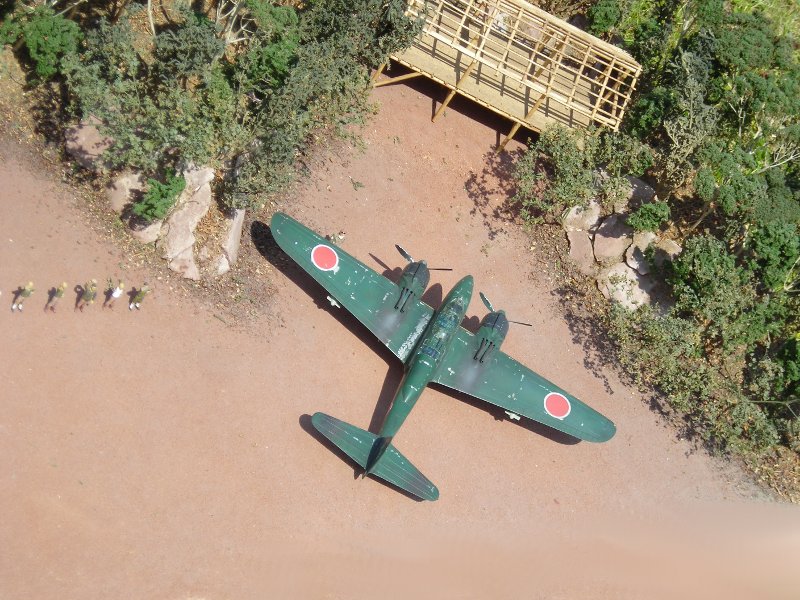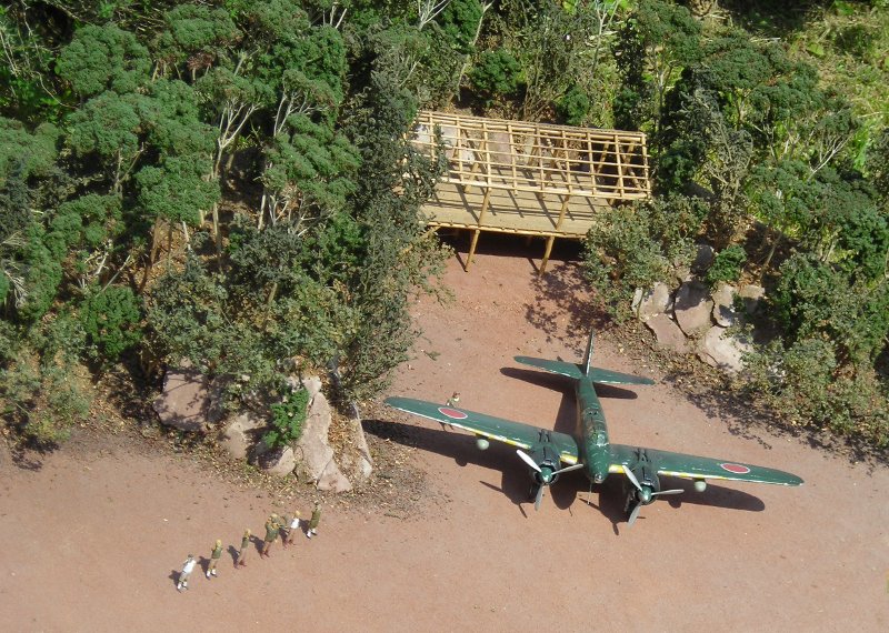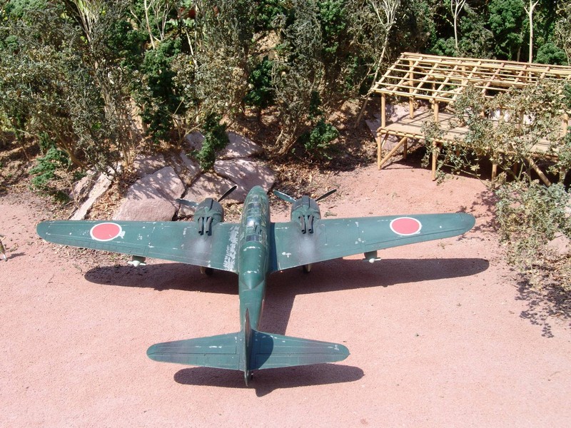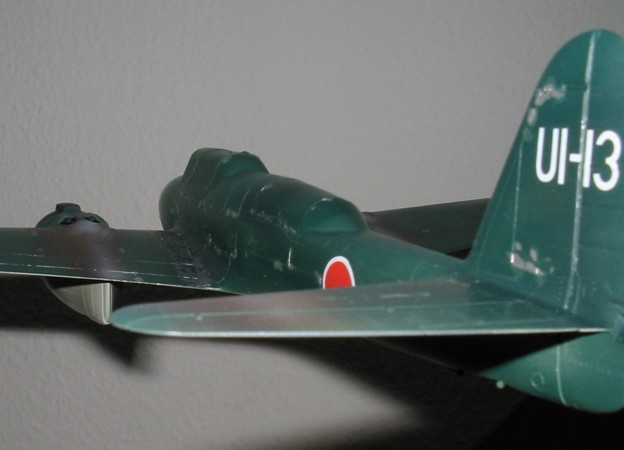 Von hier an geht der Bau recht zügig voran, und schon bald hat man ein ziemlich imposantes, sprich großes, Modell vor sich auf dem Basteltisch zu liegen. Ich wollte bei diesem Modell erstmals die Verwitterung der Oberfläche darstellen. ich bin mir nicht ganz sicher, ob dies so richtig ist, da die Marine Farben doch um einiges wiederstandsfähiger sein sollten, als die der Armeefliegerkräfte (Salzwasserresistenz, etc.). Man kann jedoch annehmen, dass die von Land startenden Flugzeuge aufgrund des Untergrundes (Korallensand) etwas stärker in Mitleidenschaft gezogen wurden und somit eine stark verwitterte Oberfläche mit Farbabplatzungen möglich war.