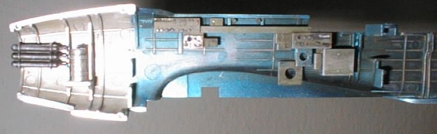Hat man - endlich - alle Teile in der Pilotenkanzel verbaut, und nebenbei auch noch die sehr schöne Waffenanlage fertiggestellt, kann man den Rumpf auch schon zusammenfügen. ich hatte mir gleich von Anfang an vorgenommen , möglichst alle Klappen geschlossen darzustellen, um die ungewöhnliche Silhouette des Modells hervorzuheben. Deshalb war es auch nicht weiter schlimm, dass während der Rumpfkomplettierungsphase ein ungeschickter Tölpel (ich) einen Topf Silberfarbe (Chromsilber mit ziemlich ätzendem Lösungsmittel) auf die Zugangsklappe zu den Schrägwaffen vergoß. Diese wollte ich eigentlich nur lose auf den Waffenschacht auflegen, um diesen Teil des Modells auch mal zeigen zu können. Jetzt brauchte ich wenigstens keinen Kleber mehr dafür "verschwenden" ...