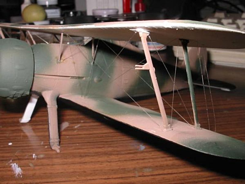 Schwierigkeiten hatte ich nur mit der Ausrichtung der Oberflügel (es ist also sinnvoll, sich eine Helling zu bauen). Ich hab schließlich die inneren Streben durch Stahlrohr (Kanülen) ersetzt und den Oberflügel und Position gezwungen. Die Verspannungslöcher hatte ich vorher bereits gebohrt. Nun habe ich mit Nylongarn verspannt und die Enden mit Sekundenkleber befestigt. Es wurde immer nach außen verklebt und die Überstände habe ich dann verschliffen, so dass die Oberfläche wieder glatt war.