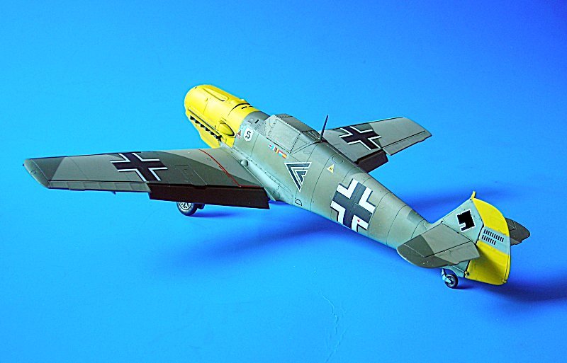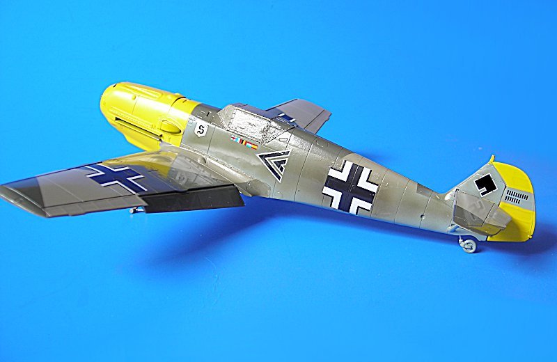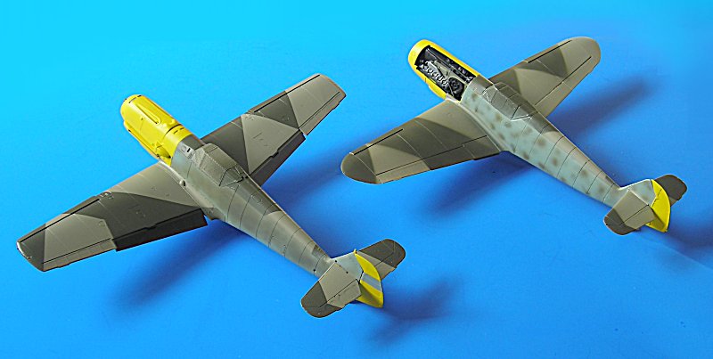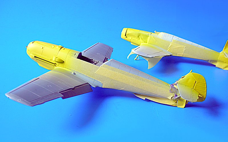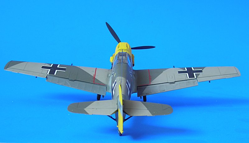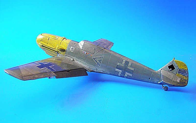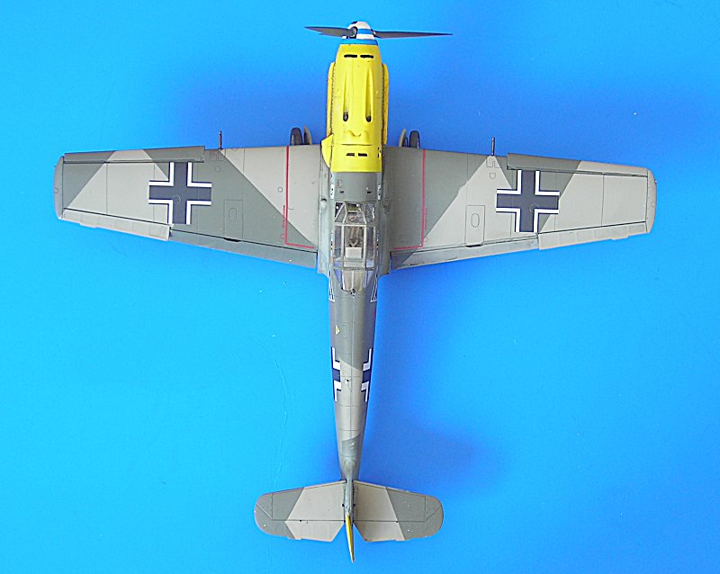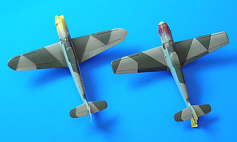 Das für das Cockpit gesagte gilt auch ansonsten und so stand der Rohbau schnell auf seinen Fahrwerksbeinen. Zunächst wurden die Gelben Flächen lackiert und abgeklebt. Dabei zog ich noch weitere Fotos aus dem Internet zu Rate, auf denen deutlicher wird, dass die Abdeckung direkt vor dem Windschutz nicht gelb gewesen ist (abweichend vom Profile im Kagero Heft). Die Unterseite wurde mit RLM 65 von Gunze gesprüht. Die Oberseitentarnung erfolgte in RLM02 und RLM71. Der 40er Anstrich wurde mit RLM 71 und 02 abgetarnt, wobei das Dunkelgrün relativ hell wirkt.