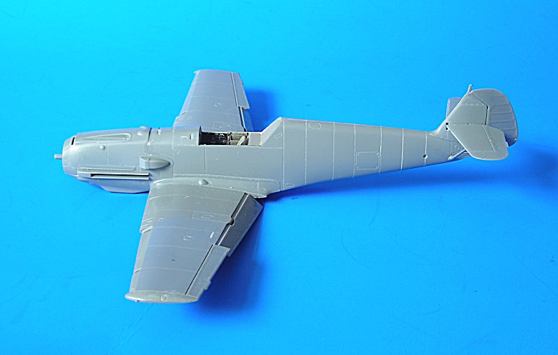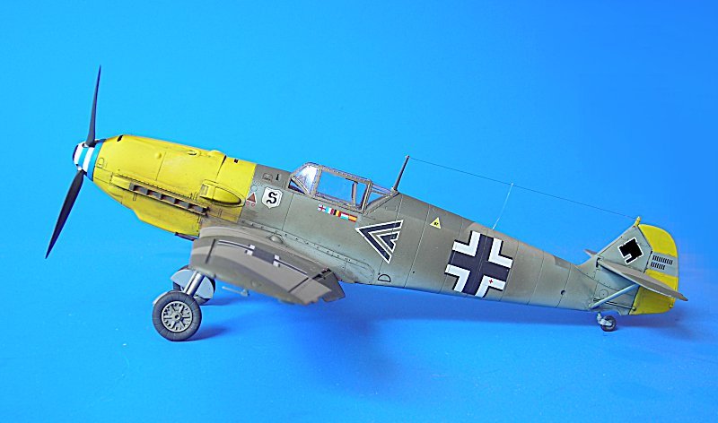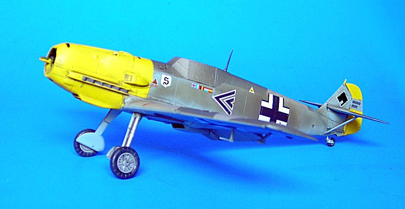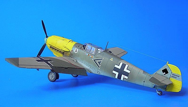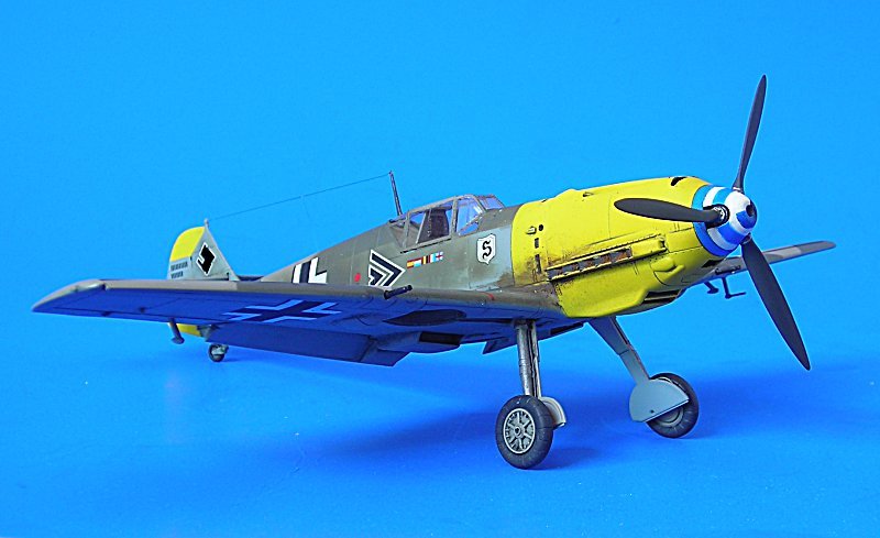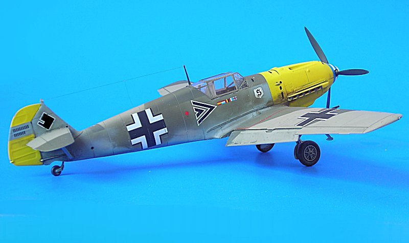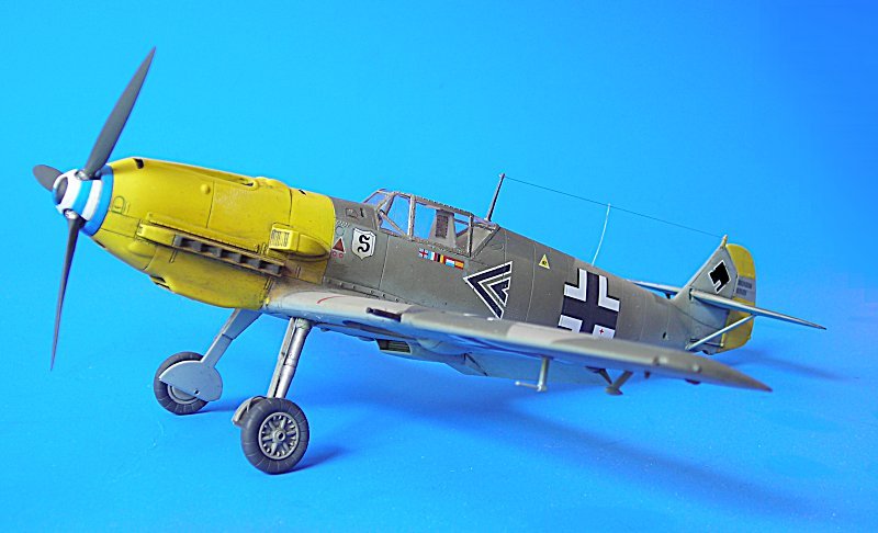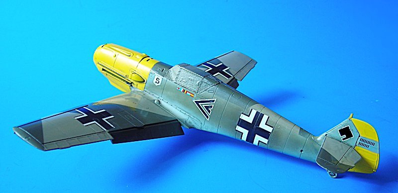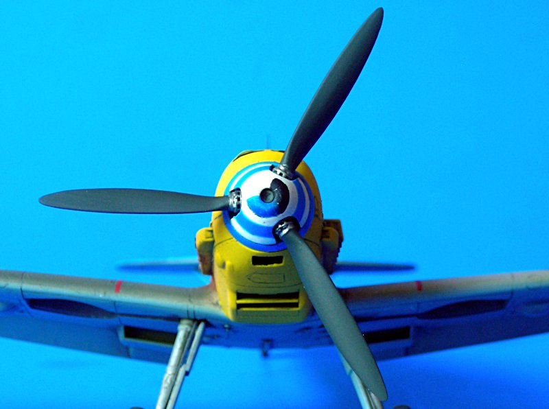 Das für das Cockpit gesagte gilt auch ansonsten und so stand der Rohbau schnell auf seinen Fahrwerksbeinen. Zunächst wurden die Gelben Flächen lackiert und abgeklebt. Dabei zog ich noch weitere Fotos aus dem Internet zu Rate, auf denen deutlicher wird, dass die Abdeckung direkt vor dem Windschutz nicht gelb gewesen ist (abweichend vom Profile im Kagero Heft). Die Unterseite wurde mit RLM 65 von Gunze gesprüht. Die Oberseitentarnung erfolgte in RLM02 und RLM71. Der 40er Anstrich wurde mit RLM 71 und 02 abgetarnt, wobei das Dunkelgrün relativ hell wirkt.