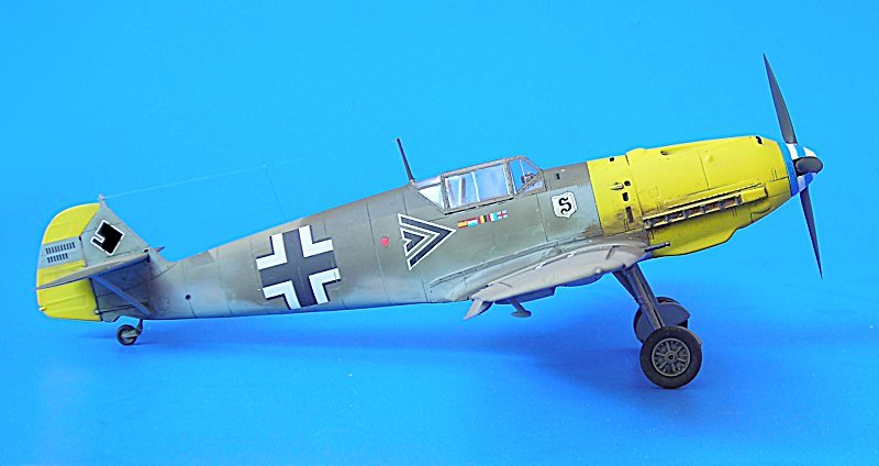 Schon kurz danach sollte es mal wieder ein einfaches Modell zur Motivation sein. Dafür bieten sich die hervorragend konstruierten Bausätze von Tamiya an und daher kam die 109 gleich auf den Basteltisch. Wenn man die dreizehnte oder vierzehnte Messerschmitt Bf109 baut ist natürlich die Frage der Markierung und Tarnung interessant. Meine Wahl fiel diesmal auf eine in den Kagero Heften zur Bf109E sehr gut dokumentierten Kommandeursmaschine von Rolf Pingel. Einen Abziehbildbogen hatte ich zu diesem Zeitpunkt noch nicht, aber ich konnte einige Standardmarkierungen aus dem Bausatz und die spezifischen Kennzeichen aus dem dem Kagero Monograph beiliegenden Abziehbildbogen entnehmen.