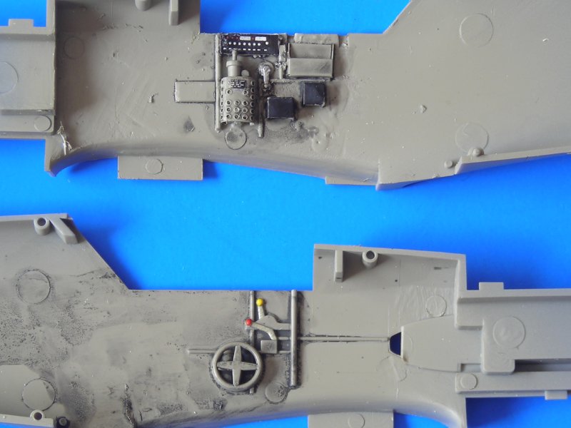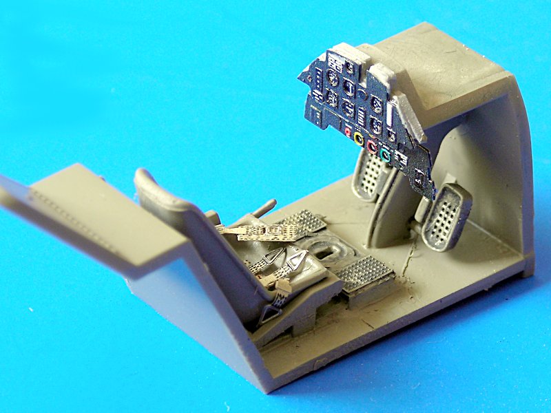 Also frisch ans Werk. Für die Gestaltung des Cockpits hatte ich mir einen Eduard "Color Zoom" Satz besorgt. Das bedruckte Instrumentenbrett und die Gurte sind diese Investition meistens wert, wobei die neuesten Sätze einen Preis haben, der dann doch zu ernsthaften Überlegungen der Sinnhaftigkeit führt. Dieser Satz war aber mit etwa 7 Euro den Preis wert. Die Farben passten leider nicht so ganz. bei der Abdeckung der Sauerstoffflasche habe ich einfach das Schild maskiert und den Rest mitlackiert. Das Instrumentenbrett ist komplett schwarz sollte aber eher RLM 66 sein. Eine Neulackierung war mir zu aufwendig und hätte auch den Verlust einiger gedruckter Details bedeutet, so dass ich mit dem kleinen Fehler leben werde.