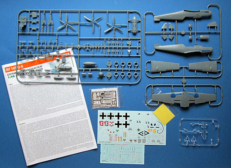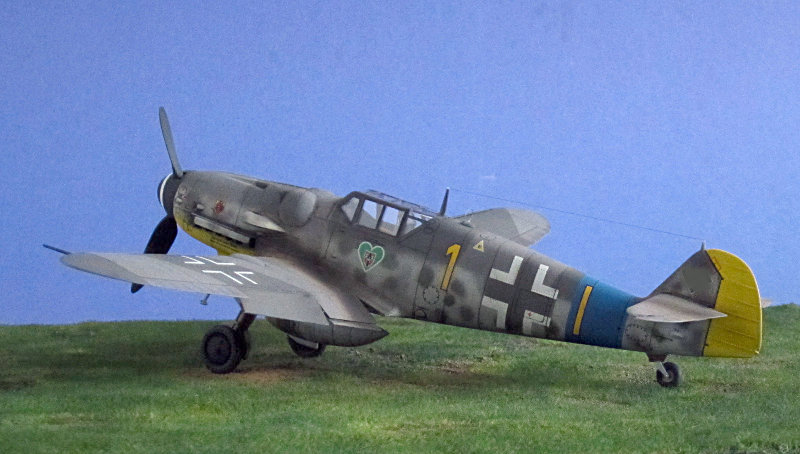 Mit Gießrahmen "I" gehts zügig weiter. An diesem merkt man auch, dass da noch mehr Dinge kommen werden: verschiedene Propeller, Spornräder und diverse weitere Optionsteile. Im Cockpit habe ich noch die Schultergurte und das Revi ergänzt. Dann noch den Kopfpanzer maskieren und RLM 66 spritzen und schon kann das Cockpit geschlossen werden. Die Masken lassen sich wie immer leicht anbringen. Die Kühlerauslassklappen sind etwas schwierig anzubringen, da sie zum Ende hin zusammenlaufen. Wie erwähnt kann man eine andere Position durch abtrennen der Montagenasen frei gestalten. Das bekannte Foto von Wilhelm Schillings Bf 109G-6 zeigt diese jedoch ausgefahren. Zu spät habe ich bemerkt, das dieses Foto das Spornrad ohne Ledermanschette zeigt und die 3 Teile gemäß Bauanleitung verbaut. Auch das Leitwerk baut sich fast von selbst. Das Seitenruder fehlt wegen späterer gelber Einfärbung. Zwischendurch habe ich die Hauptfahrwerksbeine montiert. Dann gehts auch schon an die Farbgebung beginnend mit RLM 76.
