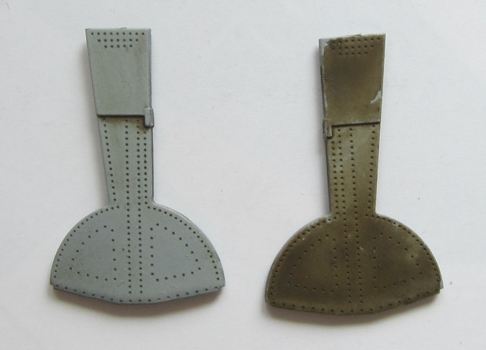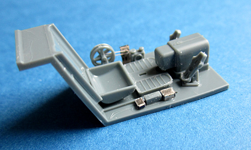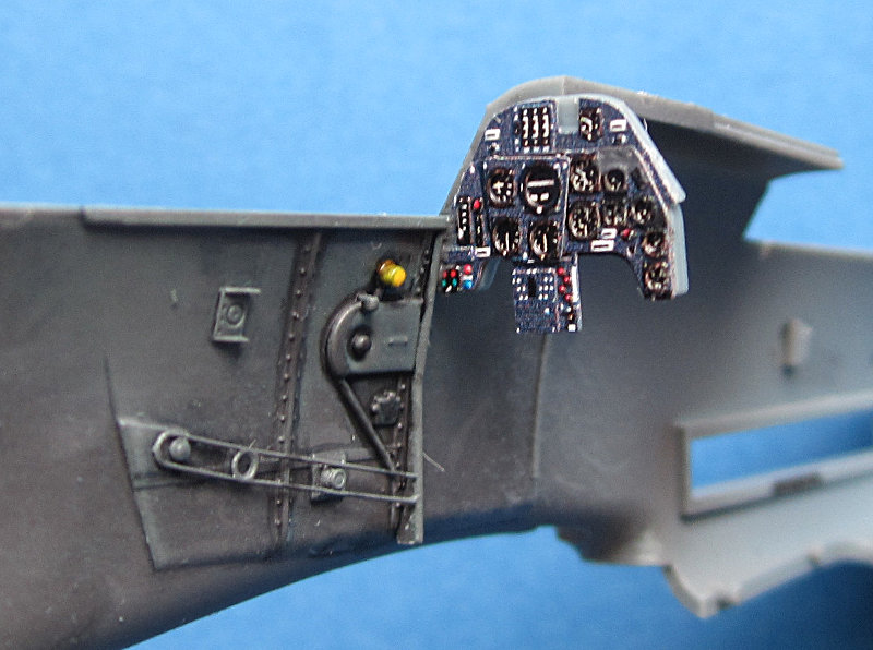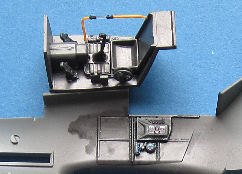 Weiter gehts im Cockpit. Nachdem die meisten Grau RLM 66 einzufärbenden Teile angebaut waren, habe ich erst mal diese Farbe mit der Spritzpistole aufgebracht. Darauf folgten ein Wash (Tamiyaprodukt Schwarz) und ein Drybrushing mit Ölfarben. Anschließend habe ich die noch fehlenden Fotoätzteile angebracht. Das Instrumentenbrett ist clever gestaltet und läßt sich nur an genau einer Position anbringen. Etwas Farbe hier und da rundet die Sache ab. Nun fehlen nur noch die Gurte und der Laden kan dicht gemacht werden. Ich bin übrigens kein Freund der PE-Seitenruderpedale (zu viel Aufwand, für zu wenig Effekt), daher habe ich die aus Plastik verwendet.