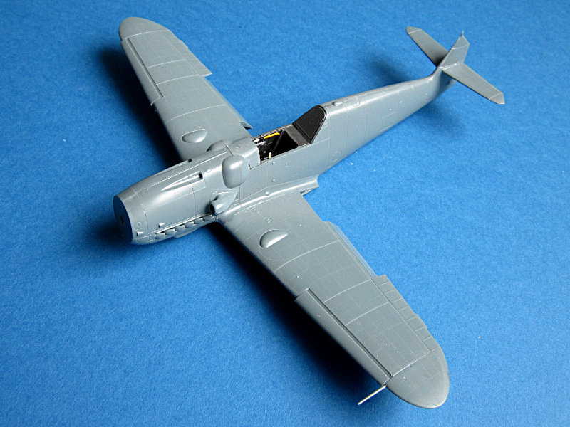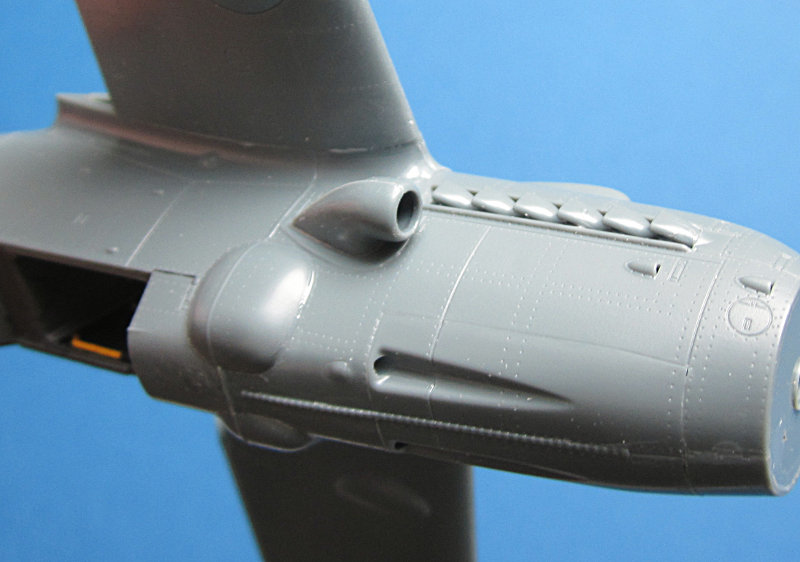 Der Laderlufteinlauf ist eine dreiteilige Angelegenheit und passt gutzusammen und in das Montageloch. Die Flächenkühler sollen mit Fotoätzteilen aufgewertet werden. Persönlich gefallen mir die Plastikteile aber besser als die Ätzteile (im Bild leider nicht gut zu sehen). Beim Ölkühler unter dem Rumpf sind die geätzten Teile aber sinnvoll. Die Flügelspitzen passen sehr gut in die dafür vorgesehenen Schlitze. Der Flügel-Rumpf-Übergang passt ganz gut, bei der Bf109E war der Sitz etwas enger. Die Steuerflächen sitzen auch sehr gut. Eduard sieht hier spezifische Positionen vor, duch abschneiden der Montagenippel kann man die Positionen jedoch individualisieren.
