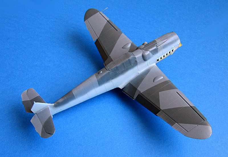 Nach einer Nacht zum Durchtrocknen habe ich den heutigen Tag habe bisher mit der Farbgebung verbracht. Gelb, dann RLM 75 und schließlich RLM 74. Ich verwende für dieses Projekt übrigens die Farben von Gunze. Eduard vertreibt diese in Tschechien und hat daher nur diese referenziert. Allerdings gefallen mir die RLM-Töne der japanischen Firma ohnehin ausgesprochen gut, so dass dies für mich kein Problem ist.
