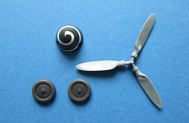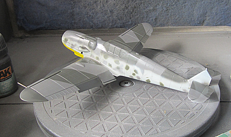 Mit den vielen Stencils gehts eher schleppend voran, insbesondere wen immer wieder Husten und Schnupfen dazwischenpfuschen. Zum Glück gibts auf dem Wartungsbogen ein paar Ersatzdecals. Die Spinnerspirale hat ganz gut geklappt. Dafür hatte ich die Grundplatte und den Spinner mit Maskol verklebt, und RLM 70 gespritzt. Leider hat der Propeller Sinkstellen, vermutlich weil die Spritzlinge preproduction shots sind. Deshalb dauerts etwas bis dieser Farbe bekommt. Die Räder habe ich nach Anleitung zusammengebaut und schwarz gespritzt. Vor dem Anbauen habe ich noch eine Standfläche hineingefeilt. Das zweite Bild zeigt den aktuellen Stand.