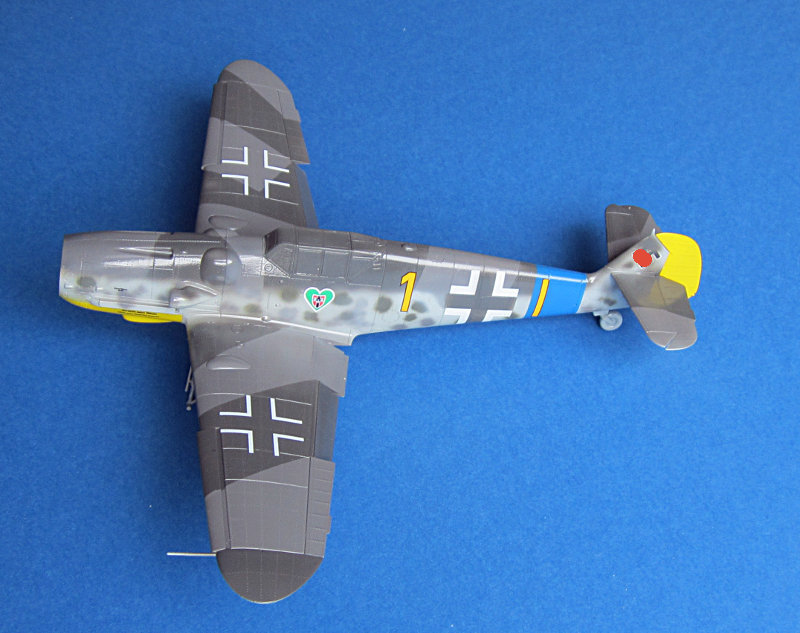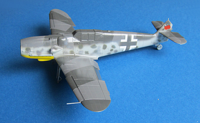 Etwas tricky ist das Anbringen der Tupfentarnung. Hiermit kann man sich echt lange befassen. Ich habe zusätzlich das Foto aus Jochen Priens Bf109-Buch zu Rate gezogen. Letztendlich ist dies aber eher eine Interpretation, denn 100% bekomme ich das meist nicht hin. Auf dem Foto ist der erste Schritt dieser Tarnung mit Klear versiegelt. Nun müssen erst die Rumpfbalkenkreuze und Hoheitszeichen angebracht werden, damit die weitere Tarnung diese überdecken bzw. ausfüllen kann.