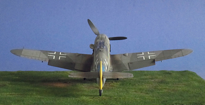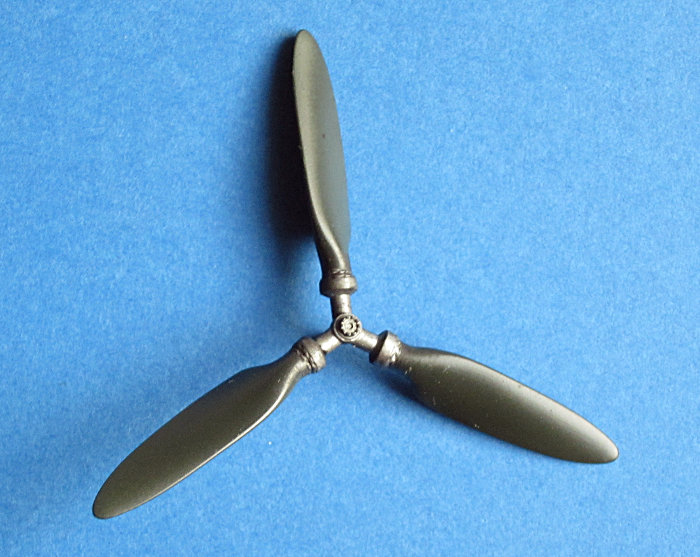 Zwischenzeitlich habe ich den Propeller in RLM 70 lackiert und mit dem Spinner vereint. Diese Baugruppe habe ich nach Abschluss des Washings mittels Gators Glue an den Bug des Modells geklebt. Auch die bisher noch separaten Landeklappen kamen ans Modell und das Spornrad wurde bemalt. Der bisherige Baufortschritt wurde nun mit Gunze H20 Mattlack versiegelt.