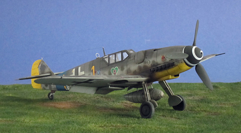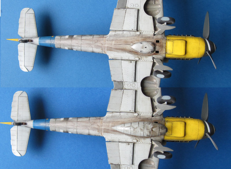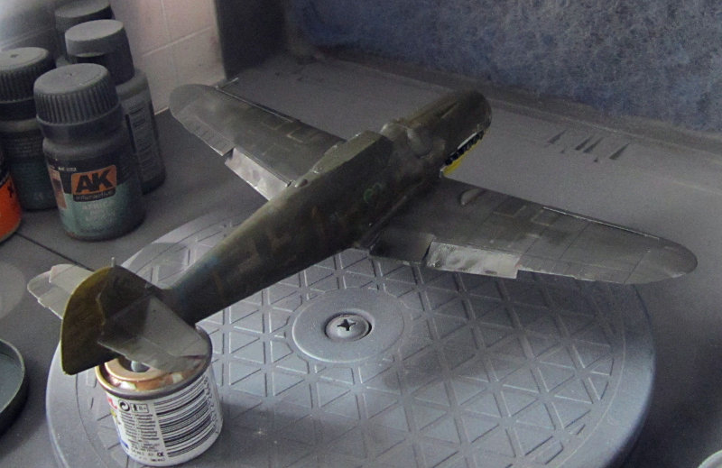 Nach längerer Überlegung habe ich mich doch noch für den Anbau des Zusatztanks entscheiden. Zum einen entspricht es dem Vorbildfoto und andereseits ermöglicht es die etwas zu steil stehenden Fahrwerksbeine zu kaschieren. Dies ist zum Teil meine eigene Schuld, da ich eine Tragfläche etwas zu nachlässig zusammengebaut habe und dadurch der Montagepunkt für das Fahrwerk zu weit nach vorn gerutscht ist. Die sind Abweichungen von deutlich unter einem Millimeter, aber sie verhindern den Fahrwerksanbau wie von Eduard vorgesehen. Ob darüber hinaus da Fahrwerk noch etwas zu lang ist und/oder ohnehin etwas zu steil montiert werden soll, kann ich nicht mit Sicherheit sagen. Nun gehts also mit der Alterung los. Ich hab gleich mal mit der Sauerei unter dem Rumpf begonnen. Auf vielen Fotos sieht man vollgeölte Abwurftanks und die Rumpfunterseite dürfte dementsprechend aussehen. Ich habe mich hier noch zurückgehalten, dam meine Mühle keinen kaputten Motor haben sollte. Übrigens war die Einsatz-Lebensdauer eines DB-Triebwerks nicht sehr viel länger als die der "berüchtigten" JuMo 004.