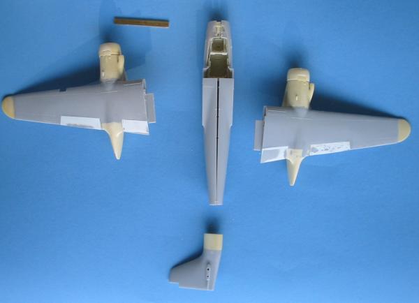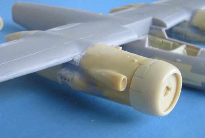 Leider habe ich im Eifer des Sägens auch gleich die als Gravur vorhandenen Landeklappen ausgesägt. Bei der Recherche für die Flammvernichtereinläufe habe ich dann festgestellt (Busse, siehe oben), dass dies für die A-2/U4 falsch ist (Spreizklappen statt Wölbungsklappen). Also mussten die oberen Ausschnitte wieder verschlossen und mit der Flügeloberfläche plan verschliffen werden. Die Motorgondeln sind mehrteilig aus Resin. Ich hatte Probleme die beiden Hauptteile so zurechtzuschleifen, dass sie plan aneinander liegen. Den Anschluss habe ich auf der einen Seite durch Verklebung mit 2K Epoxi und auf der anderen mit Magic Sculp hergestellt (verstiftet und geklebt mit Cyanacrylat).