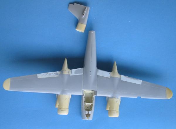 Für den Bau des Modells sind einige Besonderheiten dieses Flugzeugs zu beachte. Die Ta 154 A-2/U4 waren mit dem Jumo 213 A (C) mit eingebauter Flammvernichteranlage ausgestattet. Die anderen Motoren verursachten eine andere Schwerpunktlage und erforderten den Einbau einer Rumpftonne vor dem Leitwerk. Außerdem wurden die Motorgondeln über die Tragfläche hinaus verlängert, vermutlich um mehr Schmierstoff mitführen zu können. Da die Bordwaffen einen sehr starken Rückstoß hatten und die Lafettierung dies zunächst nicht auffangen konnte, wurde diese verstärkt. Bei diesem Muster wurden aber trotzdem nur 2 Waffen in den Rumpf eingebaut. Eine weitere Änderung betrifft die Antennenanlage, die von der Nase entfernt wurde und durch je 4 aerodynamisch verkleidete Antennen auf und unter dem Flügel ersetzt. Die genaue Ausstattung mit Funk- und Meßfunkgeräten kann man den Quellen entnehmen. (Ich habe nur die Quellen aufgeführt, die ich selbst besitze, weitere Hinweise finden sich z.B. bei Busse S.58)) Weiterhin sollte man beachten, dass andere Landehilfen verwandt wurden. Nach Busse waren die A-2/U4 mit Spreizklappen anstelle der sonst üblichen Wölbungsklappen ausgestattet. Ich hab's natürlich erst gemerkt als ich schon alle Flügelteile um die Landeklappen erleichtert und diese auch schon zusammengeklebt hatte. Ebenfalls nach diesem Artikel (m.w.N.) muss das Höhenleitwerk verlängert werden, so dass es dem Original mit 6,10 Metern entspricht. (Zum Glück habe ich 2 Revell Bausätze und den Vaku zum herumsägen)