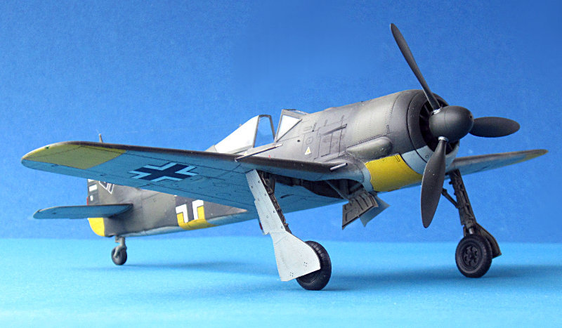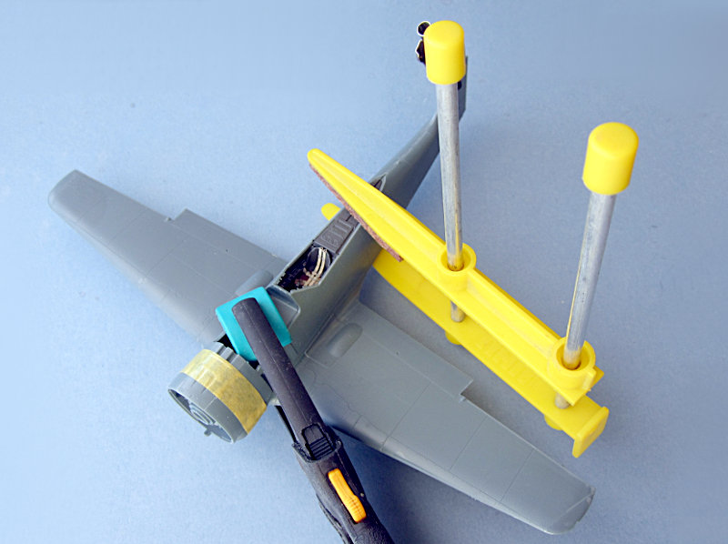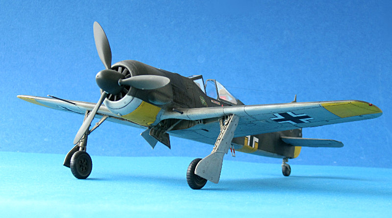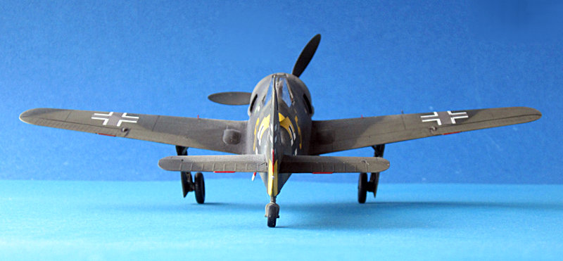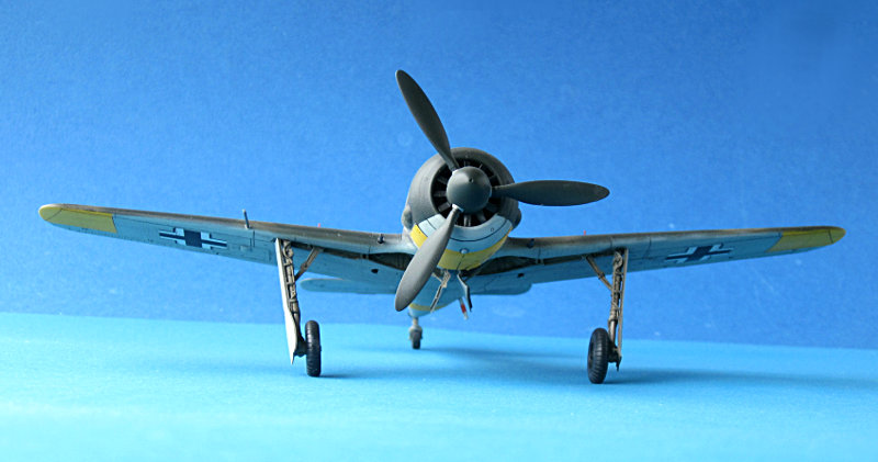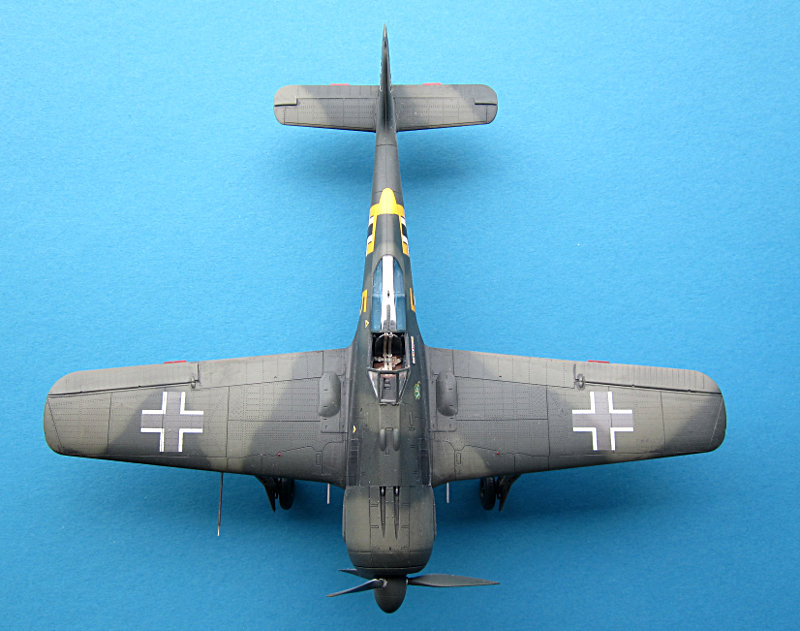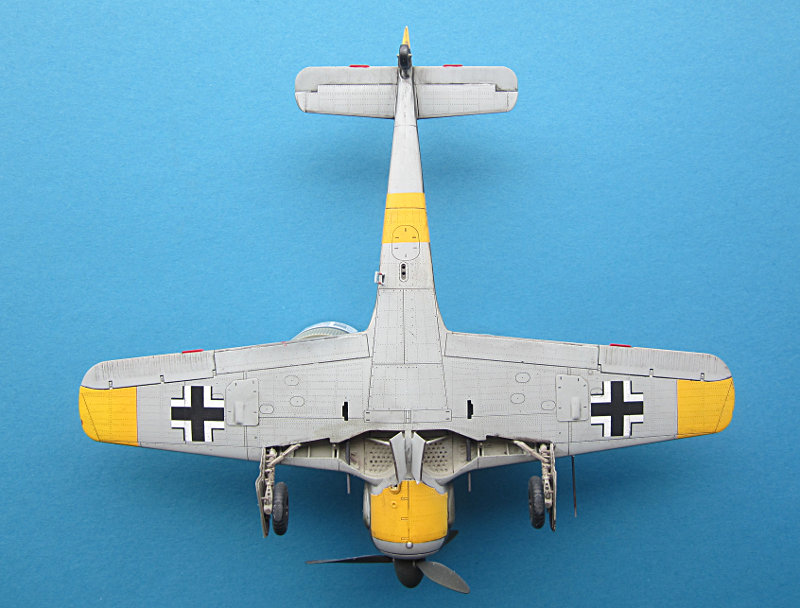 Die beiliegenden Masken passen natürlich sehr gut. Da ich die Kabine offen darstellen wollte wurde die geschlossene Kanzel mit Maskol angeklebt und nur grob maskiert - man weiß ja nie, ob man mal Ersatz braucht. Die offene Schiebehaube wurde separat maskiert und lackiert. Nach dem RLM 66 für die Klarteile wurden zunächst die gelb zu lackierenden Bereiche mit weiß grundiert. Dann folgte RLM 04 von Gunze. Die gelb verbleibenden Flächen wurden dann abgeklebt und die Lackierung mit RLM 76/70/71 aufgebracht. Ich hielt mich dabei grob an die Decalanleitung. Erik Mombeeks LuGa Spezial zum JG 26 lag mir zu dieser Zeit noch nicht vor. immerhin war dies eine nachgetarnte Maschine. Anschließend kam dann noch mehr Maskierband aufs Modell, denn die Fahrwerkschächte und -beine wurden RLM 02 lackiert.