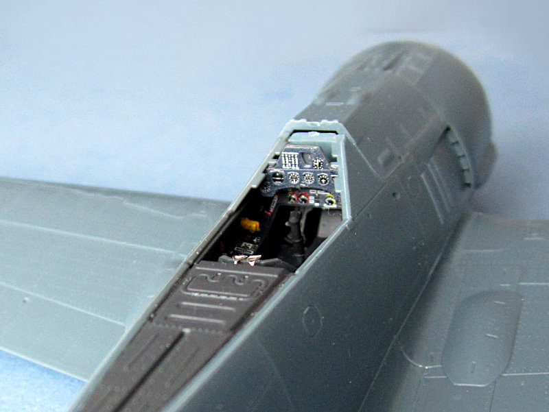 Da ich bei meiner ersten Fw 190A-4 leichte Probleme hatte, das obere Instrumentenbrett richtig zu positionieren, brachte ich es diesmal erst nach dem Zusammenfügen des Rumpfes an. Gerade bei den abgeschrägten Teilen ab A-5 passen diese so sehr gut und man muss nicht lange herumprobieren… bei der A-2 war es wegen der engen Passung allerdings ein wenig schwieriger. Hier lief alles hervorragend und nach anbringen der Ruder und Steuerflächen sah das Modell sehr schnell nach Fw 190 aus.