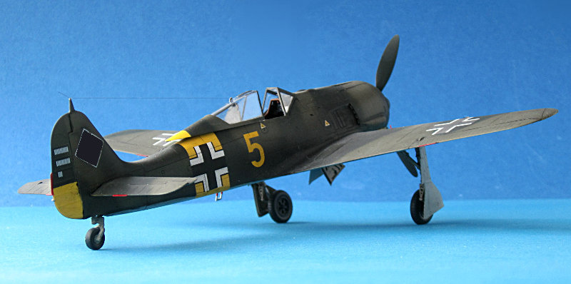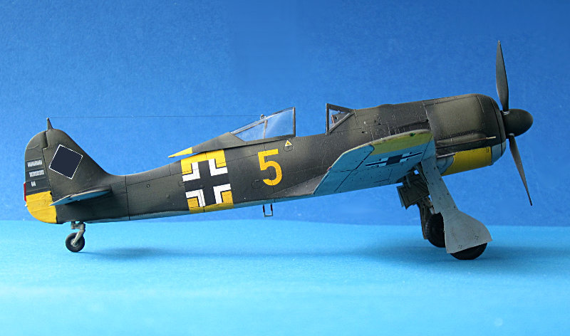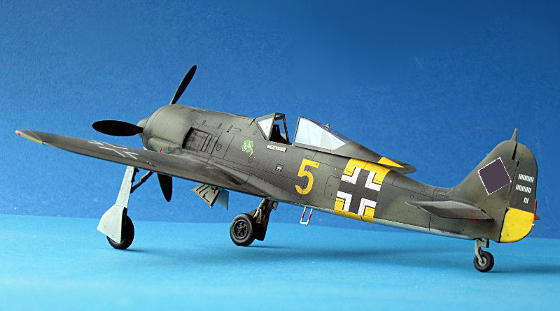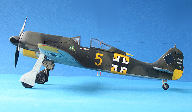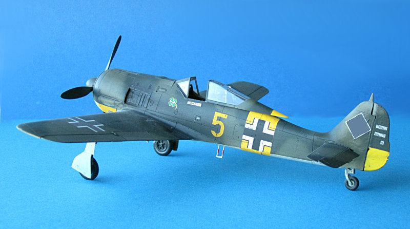 Natürlich habe ich mir sofort nach erscheinen die Fw 190 A-5 von Eduard gekauft. Leider hat es sich dann als gar nicht so einfach erwiesen, eine schöne Bemalungsvariante für eine A-5 ohne MG FF zu finden. Mit Erscheinen des Decalsatzes der neuen Firma Exito Decals hatte sich das "Problem" dann aber geklärt. Die nachgetarnte Fw 190A-5 des JG 26 an der Ostfront mit einem Piloten, der mehrfach den Frontenwechsel durchlaufen hat und trotzdem zu seinen Erfolgen kam, fand ich sehr interessant, zumal die Hoheitszeichen von der Nachlackierung ausgespart waren und somit das Modell auch optisch interessant war. Als weiteres interessantes Detail empfand ich den von einer Vorgängermaschine ausgeschnittenen Flaggensatz, der untern dem Cockpit angenietet wurde.