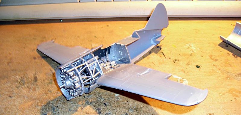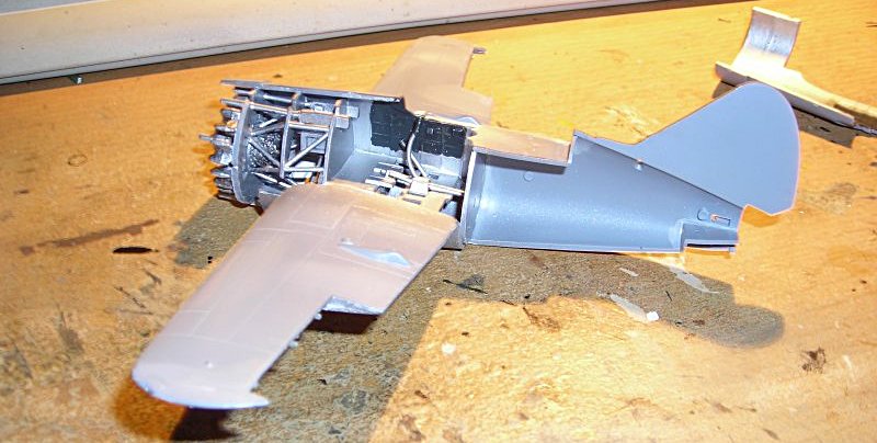 Nach den etwas längeren Vorbemerkungen also zum Modell. Eigentlich sollte es "out of the box", also ohne Zubehörteile gebaut werden. Ich bekam dann noch den Steuerflächensatz von Griffon, der sich prima anbot und auch gleich verwandt wurde. Los geht's wie immer im Cockpit und nach Bauanleitung. Dazu gehören in diesem Fall auch der Fahrwerksschacht und der Motor. Wie gesagt, sollte das Ganze nur halbwegs ohne größeren Stress über die Bühne gehen und weder künstlerischen noch technischen Ansprüchen genügen. Insgesamt war es für mich dennoch eine recht knifflige Angelegenheit, wobei ich aber die Details und Fluchereien verdrängt habe. Die Bauanleitung war zum Teil auch sehr wage, so dass schon einiger Aufwand in solche Nebensächlichkeiten gesteckt werden musste. Ich war nur froh, als ich den Rumpf "zumachen" konnte.