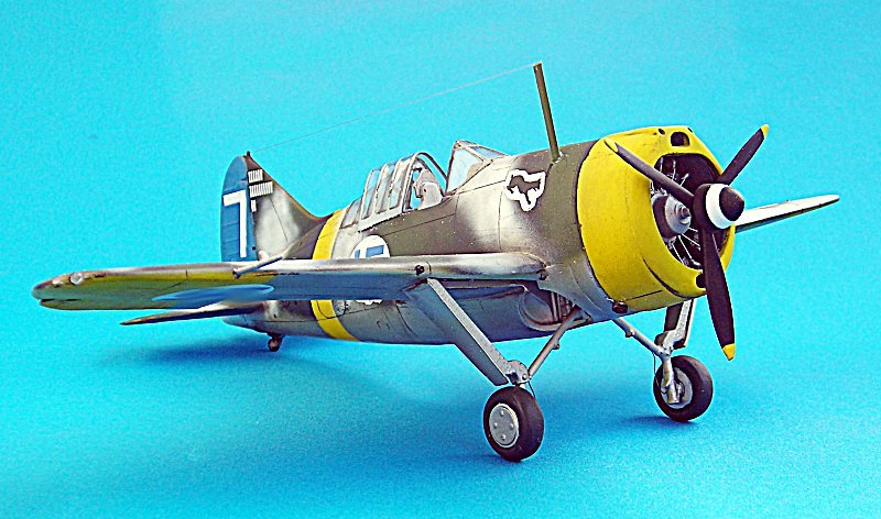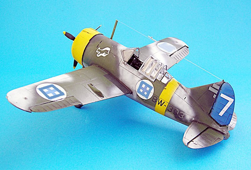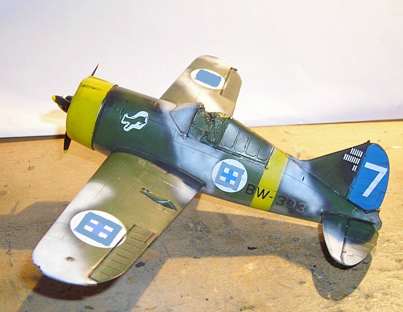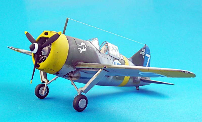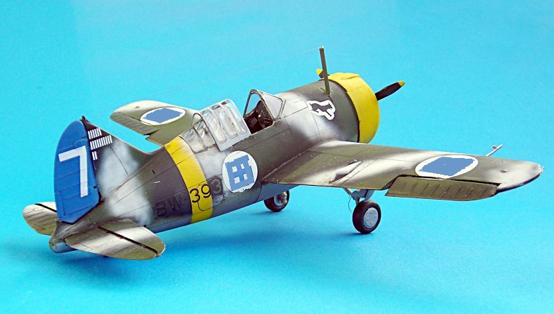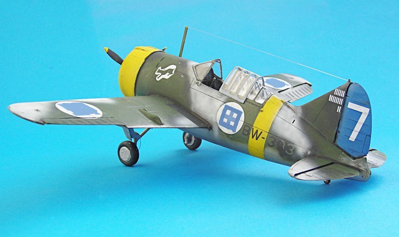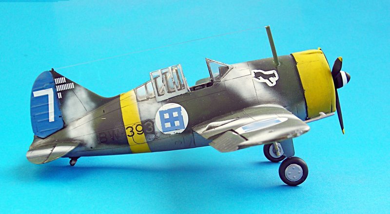 Nach einer Grundierung in schwarz, wurde das Modell silber gespritzt. Eigentlich hatte ich vor, die Maschine recht abgerissen darzustellen, aber einerseits warteten die Finnen ihre wenigen Buffalos sehr gut und andererseits gefiel mir die Winteroptik so wie sie war sehr gut. Unklar war außerdem noch, ob die Unterseite Naturmetall oder bereits in Hellblau überlackiert war. Letztendlich entschied ich mich für hellblau.