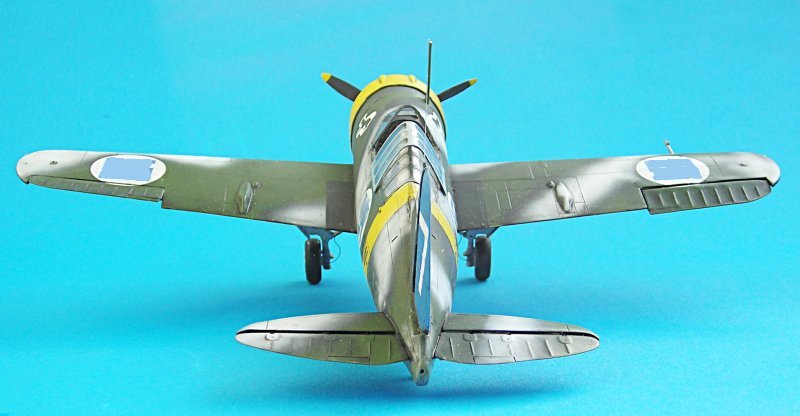 Also musste ich mir selbst eine ziehen. Dies war angesichts der Form des Bauteils zum Glück sehr einfach. Nach zwei oder drei Versuchen hatte ich ein zufriedenstellendes Ergebnis. Die Eduard-Masken machten mir dann auch die Bemalung sehr leicht, so dass die Klippe alles in allem recht einfach zu umschiffen war. Nun noch den Antennenmast dran und zum Leitwerk hin verspannen.